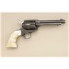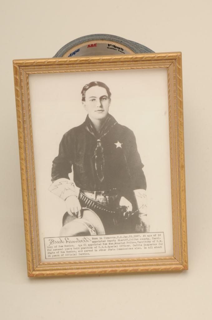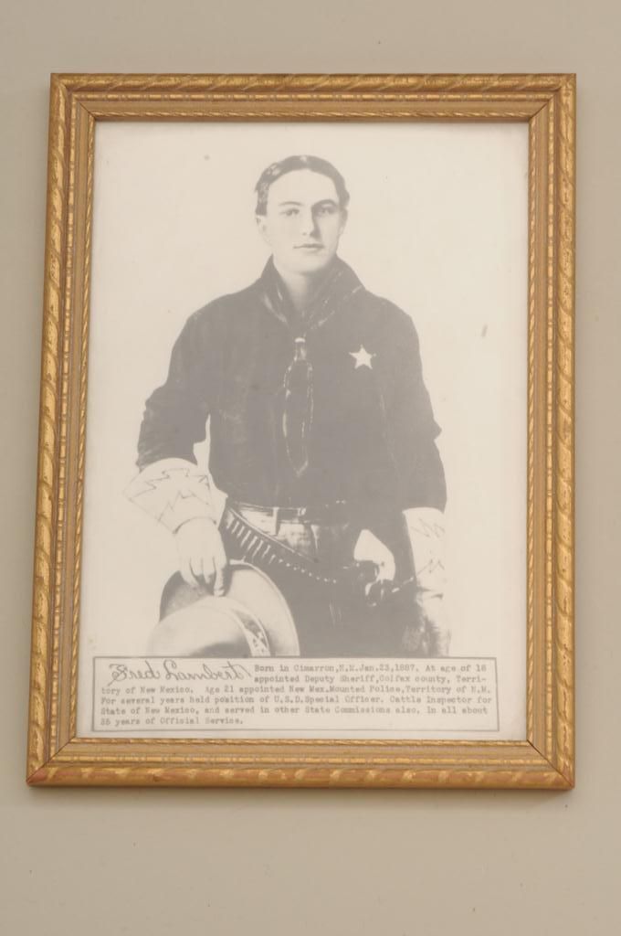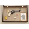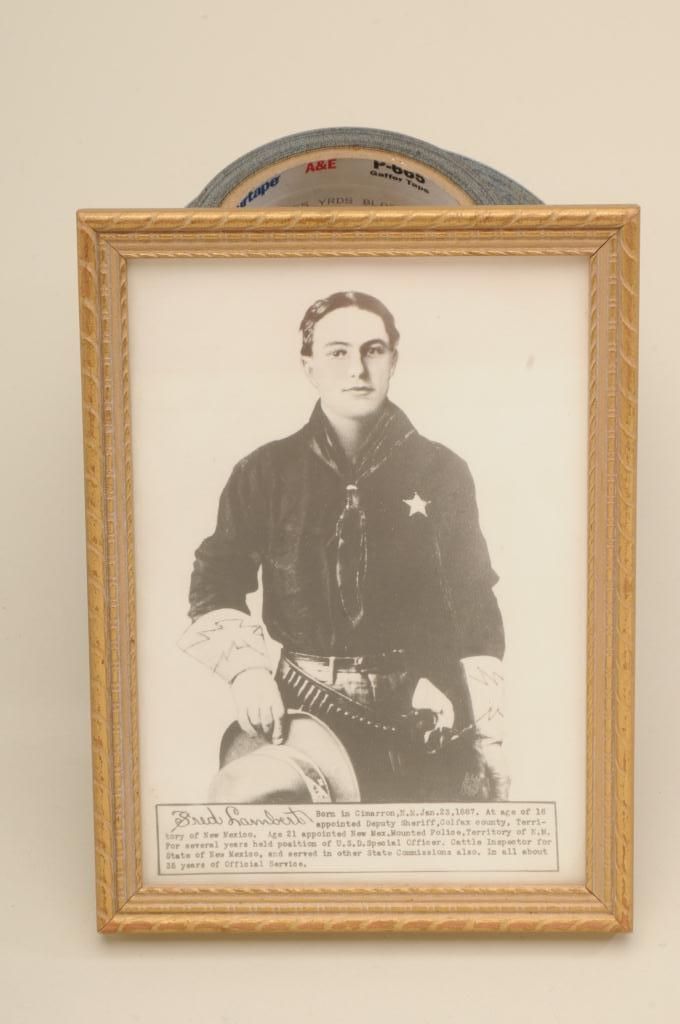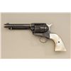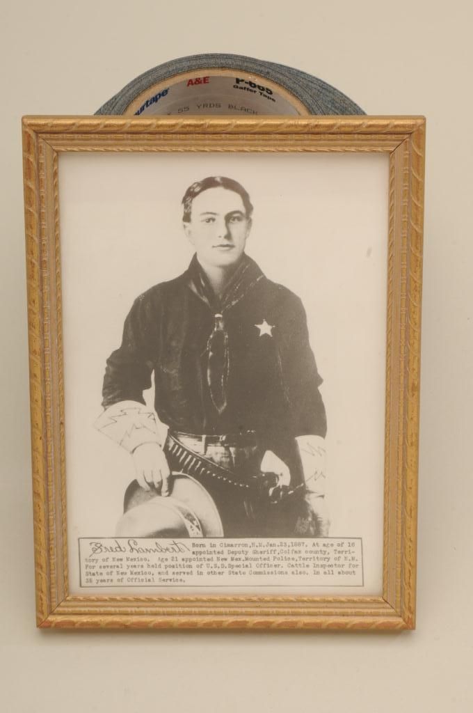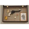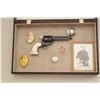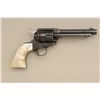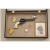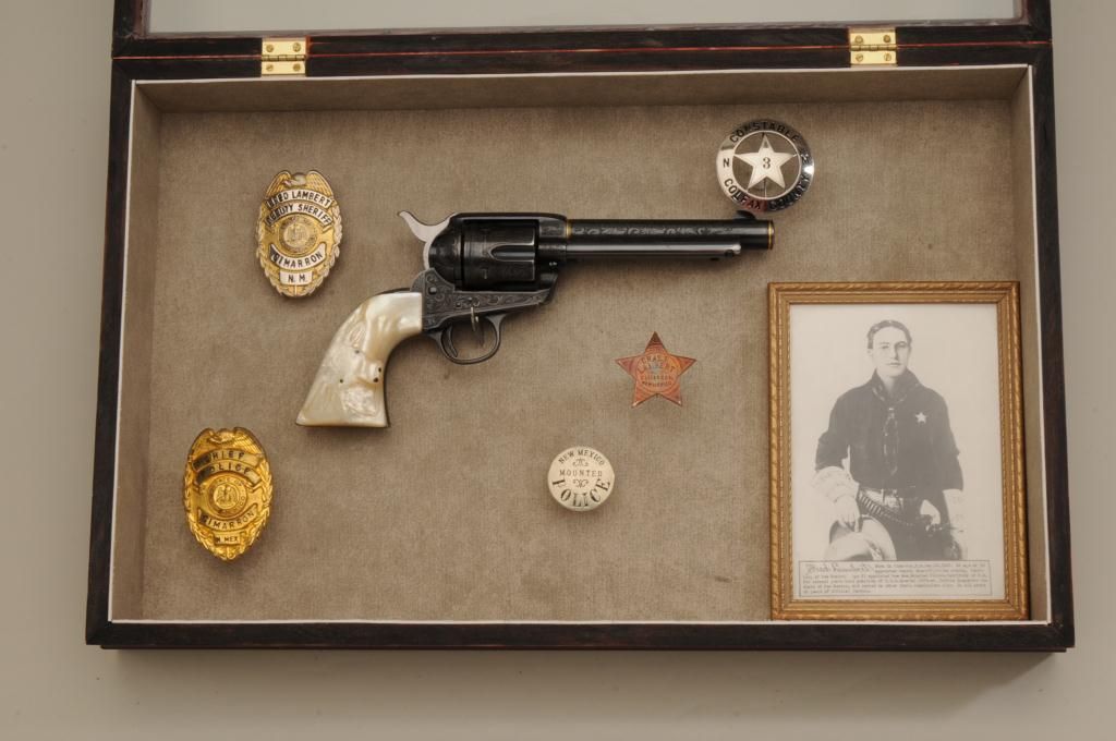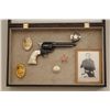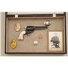 Important factory engraved, gold banded and inscribed on backstrap “CIMARRON, NEW MEXICO”, SAA revolver belonging to New Mexico lawman Fred Lambert; .32 W.C.F. cal., 5-1/2” barrel, re-blued finish, raised carved steer head pearl grips, #305332 with factory letter confirming caliber, barrel length, blue finish, factory engraved, inscribed and embellished with two gold bands, shipped to Chas. F. Lambert, address “Unavailable”,shipped January 15, 1908, one gun in shipment; also accompanied by a wood and glass display case, 5 badges, a large 3-ring binder of photos and documents related to Lambert’s lengthy career; also a record bythe Western Heritage Press of the Last Rites of Fred Lambert (1887-1971) held at the Cimarron Community Methodist Church on February 9, 1971. This gun is in overall beautiful condition as factory refinishedyears ago (note in accompanying binder suggests re-blue done by factory in the fall of 1912) showing the majority of that blue, matching visible serial numbers, fine deluxe Helfricht engraved in the style of the Sears