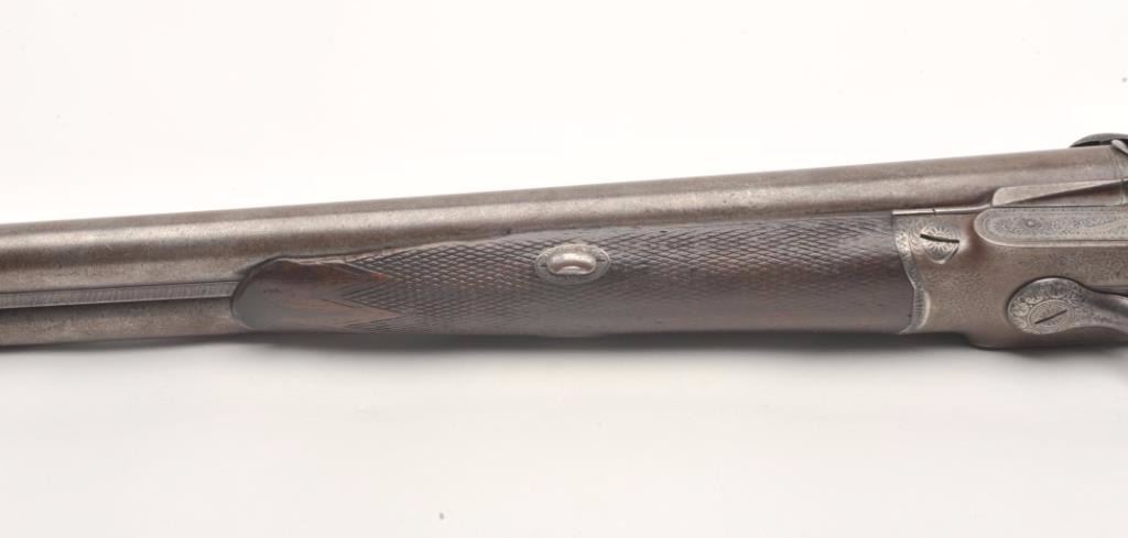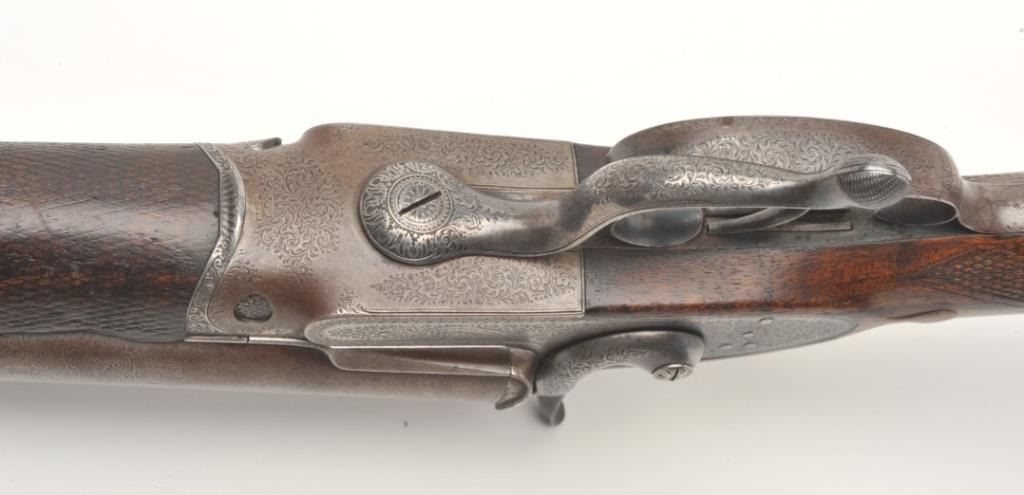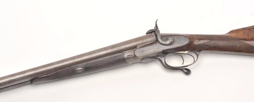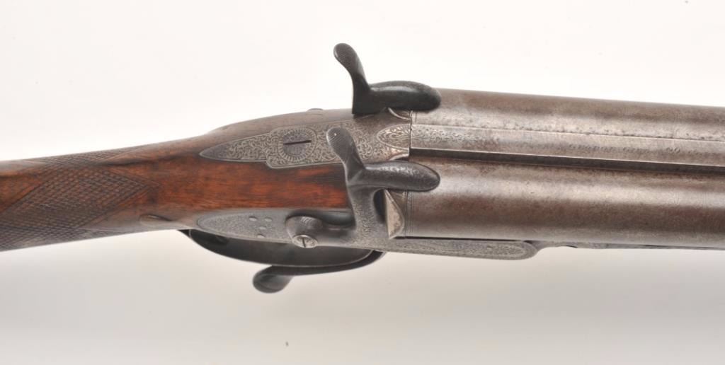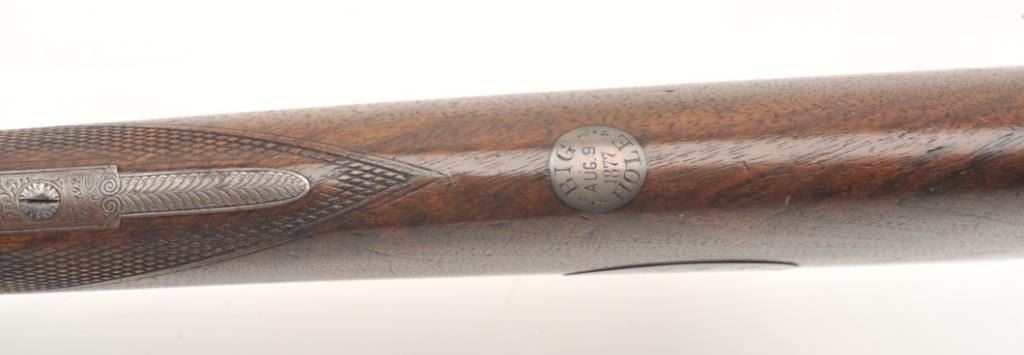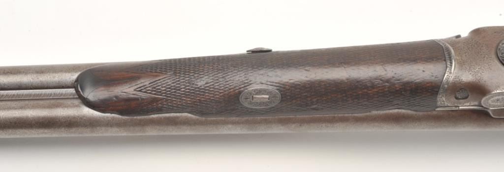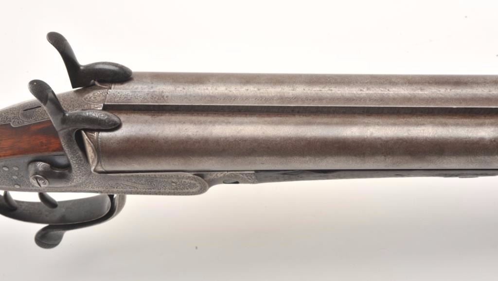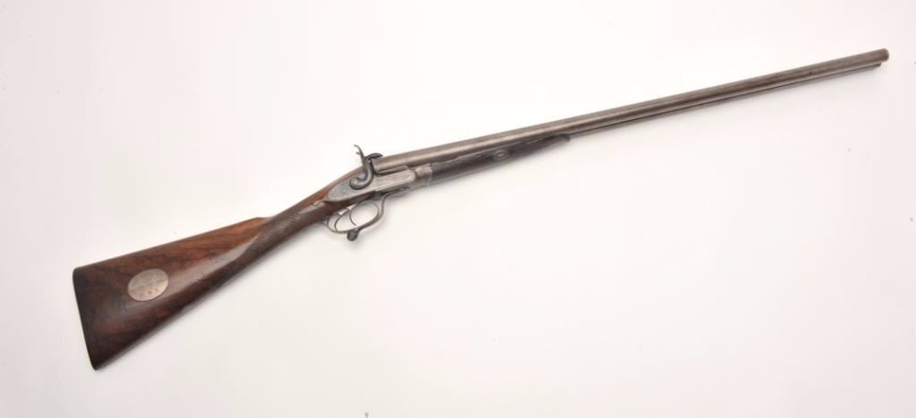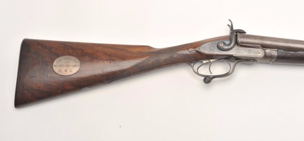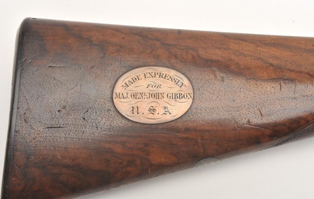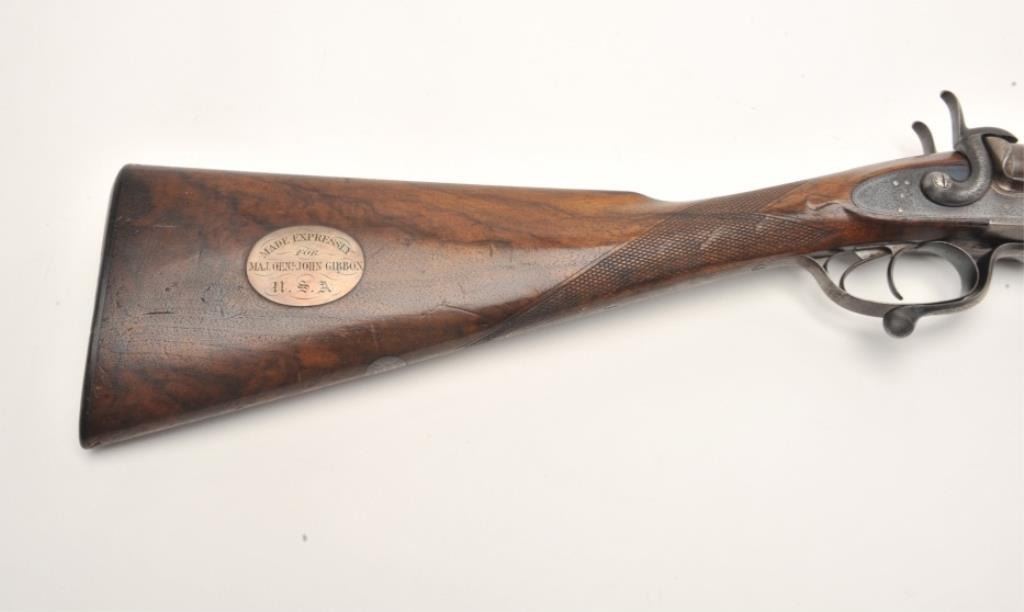 Important historically associated high grade double barrel pinfire shotgun by George Gibbs of Bristol, England with two silver engraved plaques that are period inscribed “Made Expressly for Maj. Genl. John Gibbon, USA” mounted at the center portion of the right side butt stock and “Big Hole/August 9th, 1877” on the underside of the butt stock. The gun is 12 gauge with 30” Damascus pattern barrels, finely scroll engraved locks with traces of original case colors drifting to silver toning. The stocks show some wear from carry, small losses but generally very good overall. The actions are good, the bores also good. The gun is signed on the barrel rib and both locks. The S/N is B292 and located on the lower tang of the trigger guard. Gibbon was born in Pennsylvania in 1827, and graduated from the U.S. Military Academy in 1847. He served in the Mexican-American War, the Seminole War and later the American Civil War as Brigadier-General of volunteers. He commanded a brigade through the Northern Virginia, Maryland, Rappahannock and Pennsylvania campaigns of 1862-63 and was brevetted Major in the regular Army for gallantry and meritorious services in the battle of Antietam. At the battle of Fredericksburg, he was severely wounded (was brevetted Lt. Colonel) and then brevetted Colonel on July 4, 1863, for services at Gettysburg, where he was again severely wounded. On June 7, 1864, Gibbon became Major-General of Volunteers while engaged in the battles of the Wilderness, Spottsylvania and Cold Harbor. He then commanded the 24th Army Corps at Petersburg and was brevetted Brigadier-General and Major-General, U.S.A. on March 13, 1865, later being one of the commissioners to carry into effect the stipulations of Lee’s surrender. After the War, Gibbon commanded several posts in the West during the Indian Wars. He took part in the 1876 campaign in which Custer was defeated at the Little Big Horn, with Gibbon’s troops arriving on the field in time to rescue the survivors and bury the dead. In 1877, as referenced in the smaller of the two plaques of this shotgun, he took part in the campaign against the Nez Pierce and Chief Joseph, where he was again seriously wounded. Gibbon later served in the Army’s Dept. of Columbia and the Dept. of the Pacific until his retirement in 1891. He died on February 6, 1896 and is buried in the Arlington National Cemetery. Included with this lot are 2 binders of information about General Gibbon’s lengthy and storied service to his Country with copies of his files held in the National Archives and other related information including details of his efforts during the campaigns of the Little Big Horn and the Big Hole. An outstanding piece of U.S. Military history having belonged to one of its most active and long serving Officers (44 years). Originally from the famous Texas collection of the late Col. William R. Orbelo. (Antique). Est.: $9,000-$18,000.
