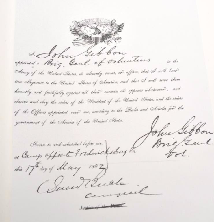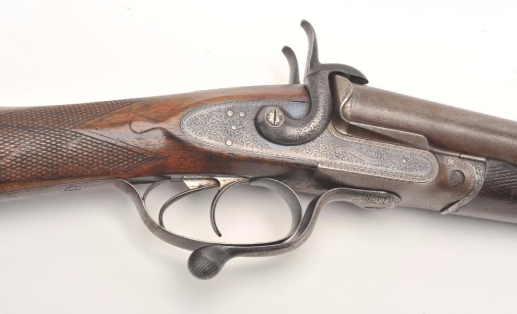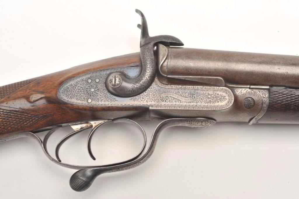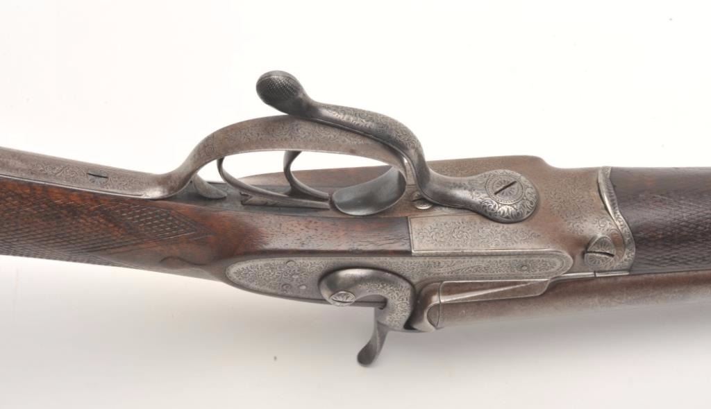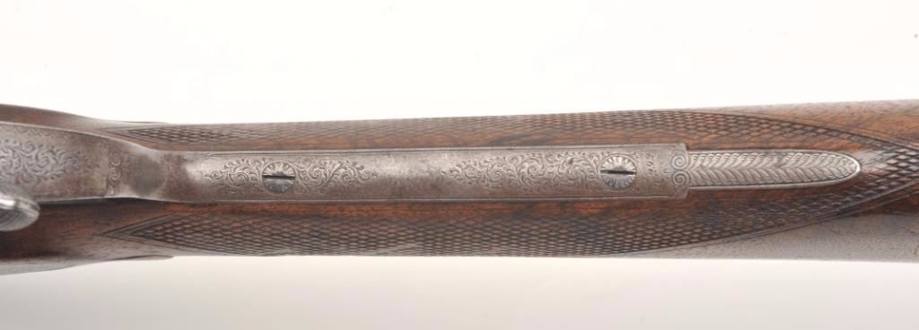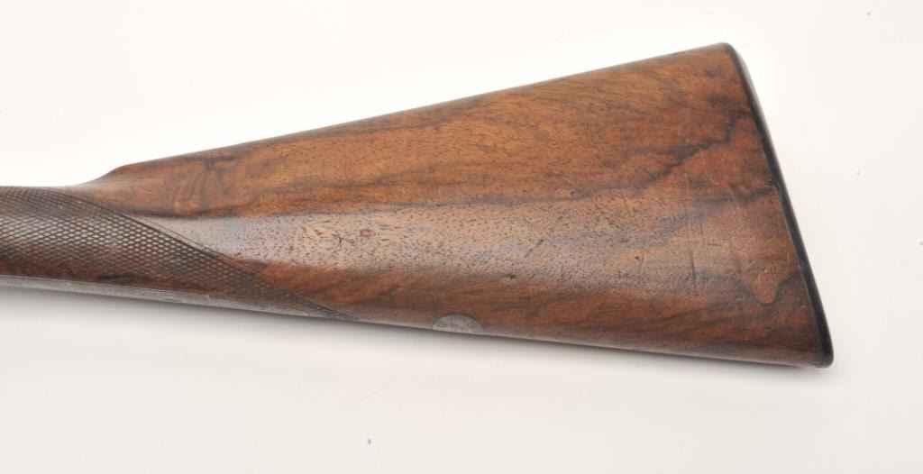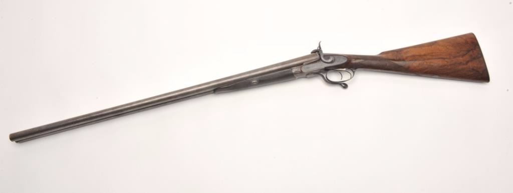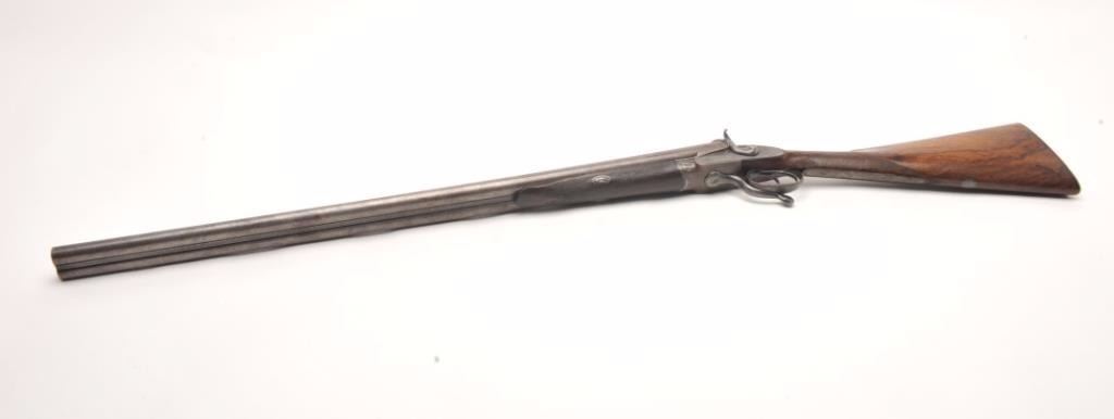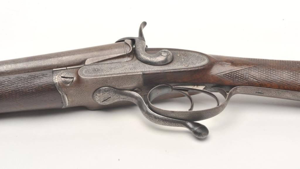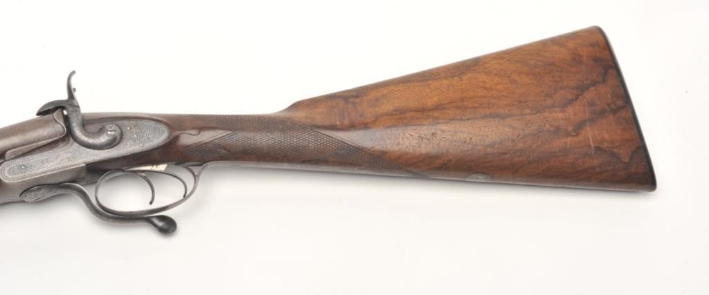 Important historically associated high grade double barrel pinfire shotgun by George Gibbs of Bristol, England with two silver engraved plaques that are period inscribed “Made Expressly for Maj. Genl. John Gibbon, USA” mounted at the center portion of the right side butt stock and “Big Hole/August 9th, 1877” on the underside of the butt stock. The gun is 12 gauge with 30” Damascus pattern barrels, finely scroll engraved locks with traces of original case colors drifting to silver toning. The stocks show some wear from carry, small losses but generally very good overall. The actions are good, the bores also good. The gun is signed on the barrel rib and both locks. The S/N is B292 and located on the lower tang of the trigger guard. Gibbon was born in Pennsylvania in 1827, and graduated from the U.S. Military Academy in 1847. He served in the Mexican-American War, the Seminole War and later the American Civil War as Brigadier-General of volunteers. He commanded a brigade through the Northern Virginia, Maryland, Rappahannock and Pennsylvania campaigns of 1862-63 and was brevetted Major in the regular Army for gallantry and meritorious services in the battle of Antietam. At the battle of Fredericksburg, he was severely wounded (was brevetted Lt. Colonel) and then brevetted Colonel on July 4, 1863, for services at Gettysburg, where he was again severely wounded. On June 7, 1864, Gibbon became Major-General of Volunteers while engaged in the battles of the Wilderness, Spottsylvania and Cold Harbor. He then commanded the 24th Army Corps at Petersburg and was brevetted Brigadier-General and Major-General, U.S.A. on March 13, 1865, later being one of the commissioners to carry into effect the stipulations of Lee’s surrender. After the War, Gibbon commanded several posts in the West during the Indian Wars. He took part in the 1876 campaign in which Custer was defeated at the Little Big Horn, with Gibbon’s troops arriving on the field in time to rescue the survivors and bury the dead. In 1877, as referenced in the smaller of the two plaques of this shotgun, he took part in the campaign against the Nez Pierce and Chief Joseph, where he was again seriously wounded. Gibbon later served in the Army’s Dept. of Columbia and the Dept. of the Pacific until his retirement in 1891. He died on February 6, 1896 and is buried in the Arlington National Cemetery. Included with this lot are 2 binders of information about General Gibbon’s lengthy and storied service to his Country with copies of his files held in the National Archives and other related information including details of his efforts during the campaigns of the Little Big Horn and the Big Hole. An outstanding piece of U.S. Military history having belonged to one of its most active and long serving Officers (44 years). Originally from the famous Texas collection of the late Col. William R. Orbelo. (Antique). Est.: $9,000-$18,000.
