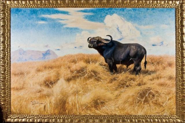 Important original oil painting signed by Wilh. Kuhnert showing Cape Buffalo. Measuring approx. 48” by 72” (image). Fine condition and in museum quality carved and gold gilt frame. Wilhelm Kuhnert (1865 - 1926) was particularly noted for his African wildlife scenes and is his works have commanded up to $600,000 in this size. Considered by many art experts the top African wildlife artist that worked in the pre-war era. From the Robert Petersen Collection. Est: $225,000 - 450000