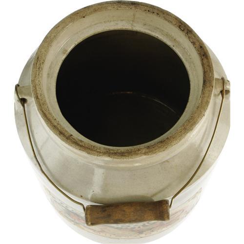 <B>Imposing, Large Heinz Mustard Crock.</B></I> This piece has the potential to be the centerpiece for some lucky hobbyist's collection! Measuring 11.5" tall and 10" wide, this massive crock still has its original label and handle. The label measures 9" x 4", and features the "Heinz's Keystone" brand name and seal. The colorful and bountiful label depicts all sorts of vegetables, as well as all the flourish and decoration associated with Heinz pieces. The crock is in choice condition with no chips on the edges; the label is still in excellent condition with only a few minor tears and chips along the edges; the lower left corner is the most troublesome, but with a crock this size and in this condition these minor flaws detract minimally.