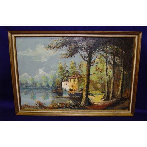Oil on masonite signed Tom Velter lower right and is a colorful impressionist depiction of a European country cottage besides a wooded lake, measuring 24 x 36 inches and the frame measuring 27 1/2 x 39 1/2 inches.