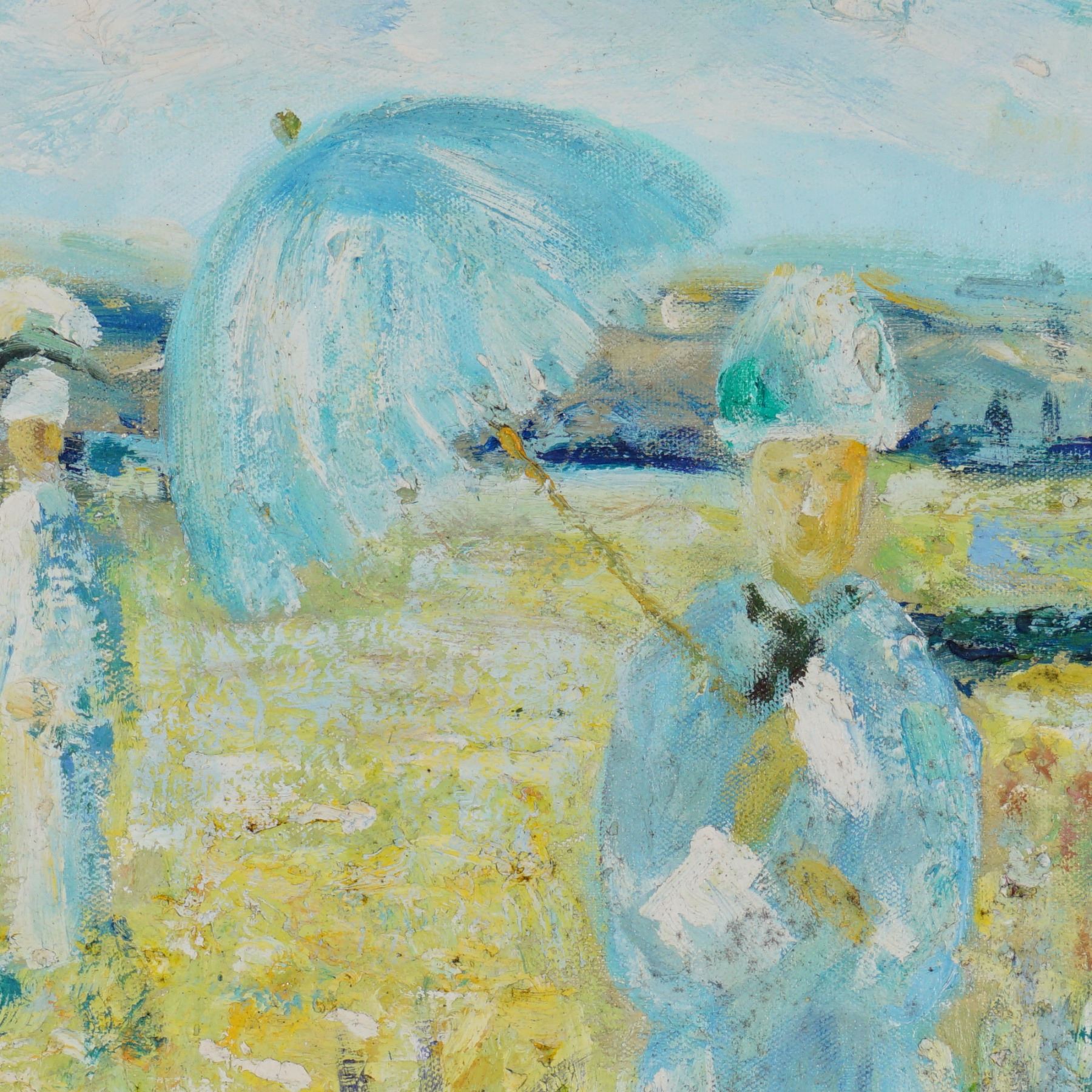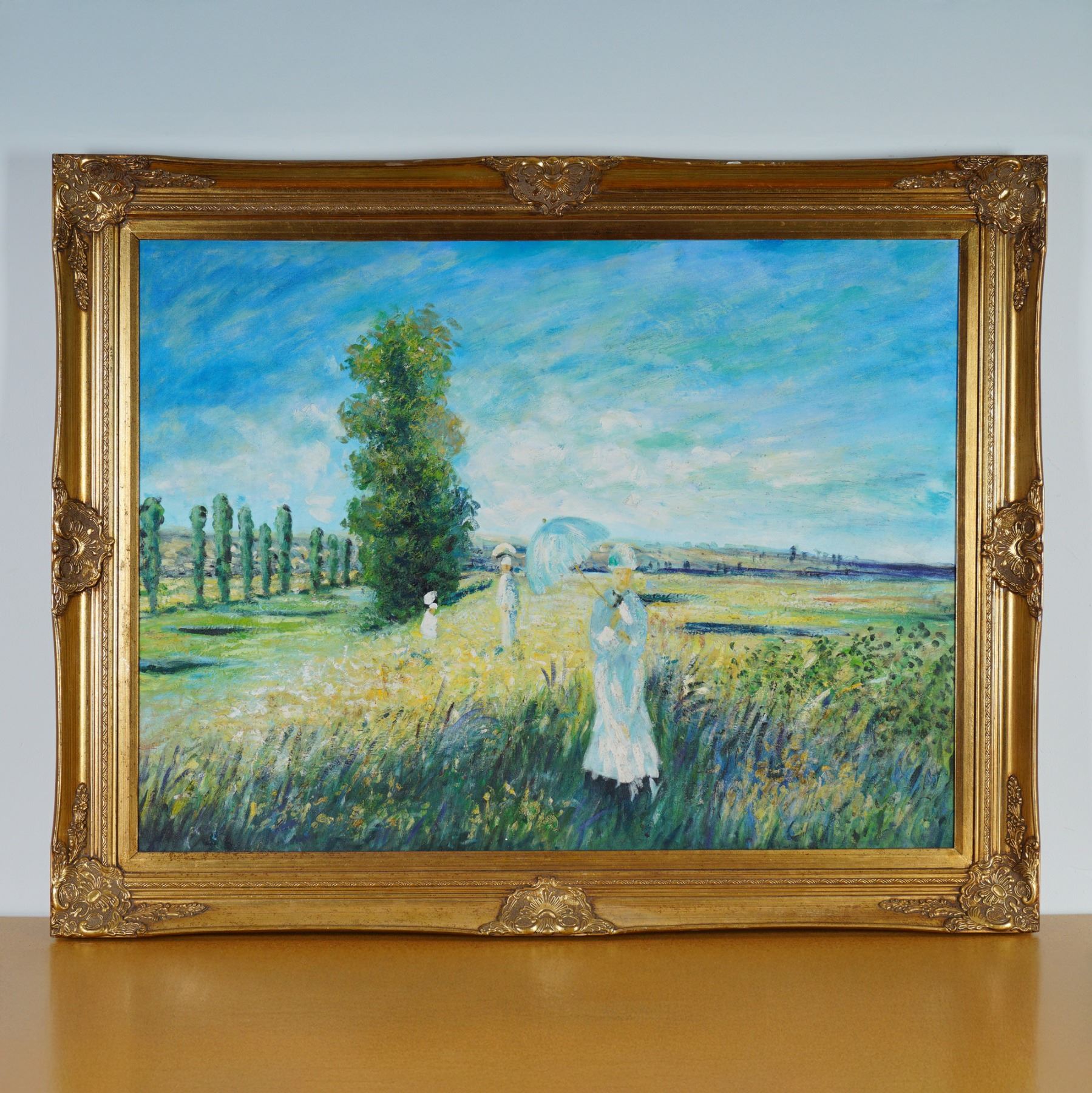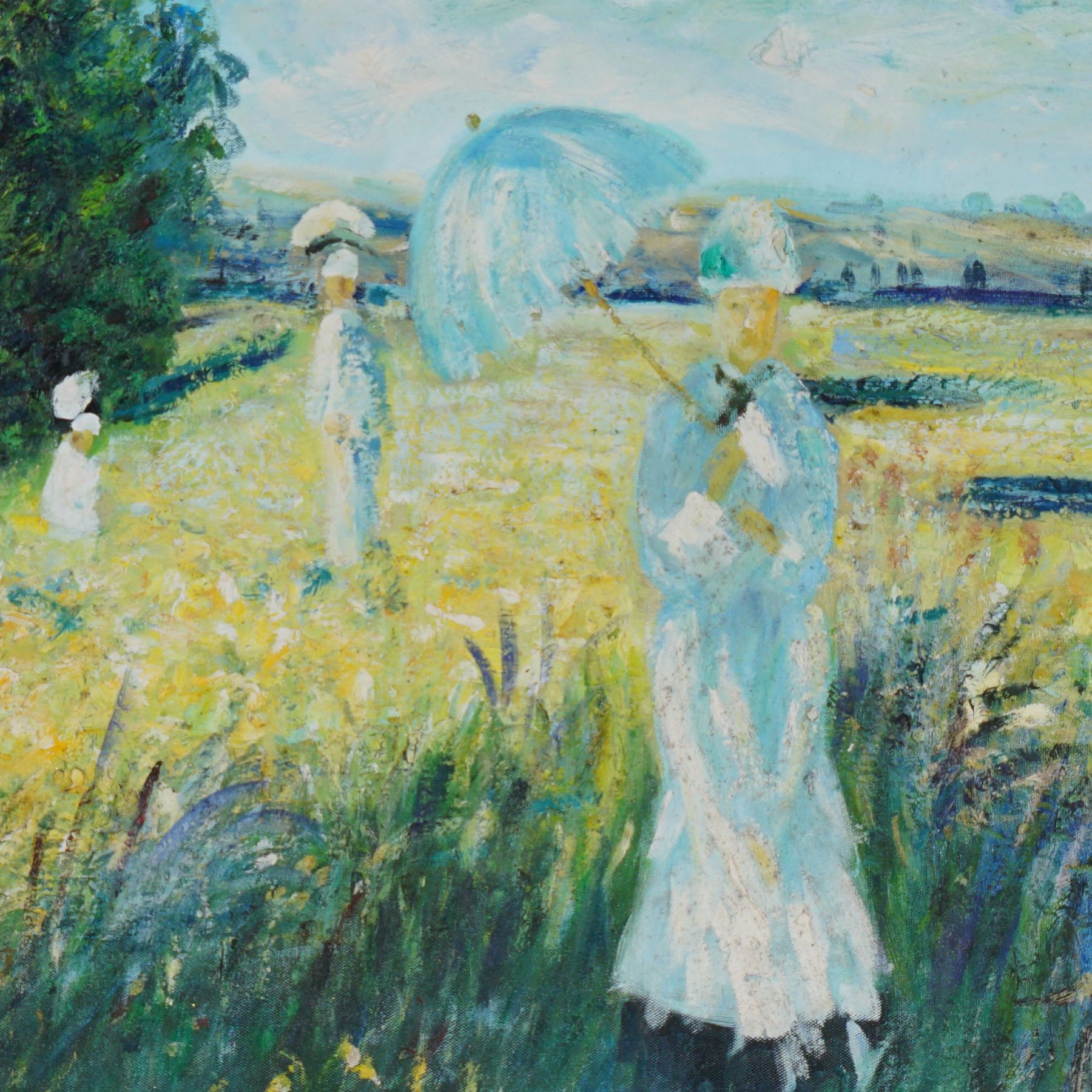 Oil on canvas landscape rendered in the manner of Claude Monet depicting three female figures dressed in white, walking through a sunlit field under a vibrant blue sky. The central figure holds a parasol, evoking Monet's famous depictions of women in nature. Executed with thick impasto brushwork and rich impressionist color blending, the scene captures the fleeting light and motion of a summer day. Presented in an ornate giltwood frame.