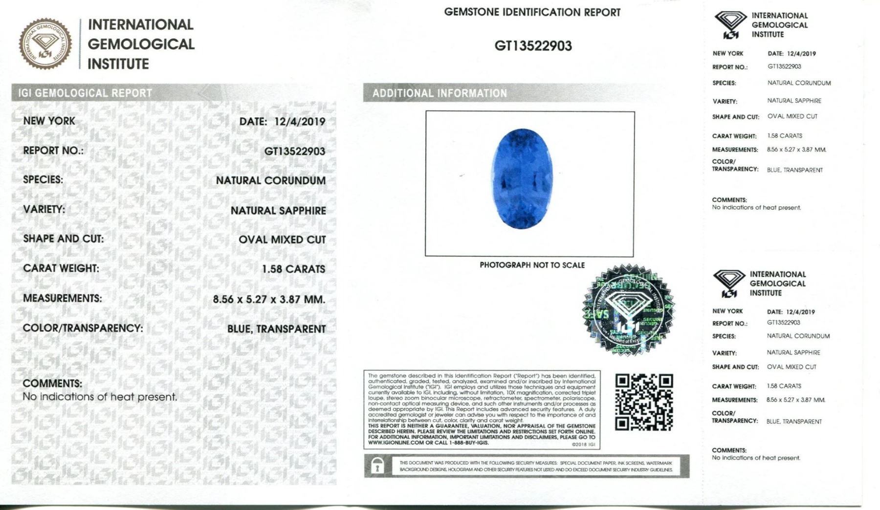 Incredible 1.58 Ct Blue Sapphire measuring 8.56 x 5.27 x 3.87 mm with a mixed oval cut. Displays a lovely blue hue and would make a perfect centerstone for any jewelry piece!!! Treatment: None. Please see the certification for additional information.