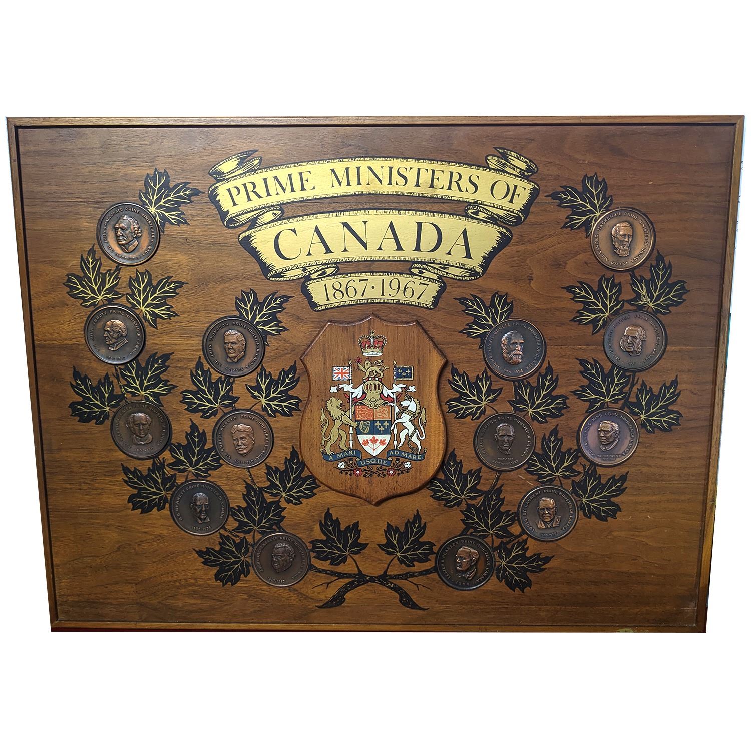 *Impressive! 1867-1967 Prime Ministers of Canada 14pc Bronze Medal Set in Solid Wood Board. The solid wood board is beautifully painted and features a pop-out Canadian coat of arms. 14 medals are included featuring Prime Ministers from Sir John A. Macdonald to Lester B. Pearson. Note a few imperfections on the board.