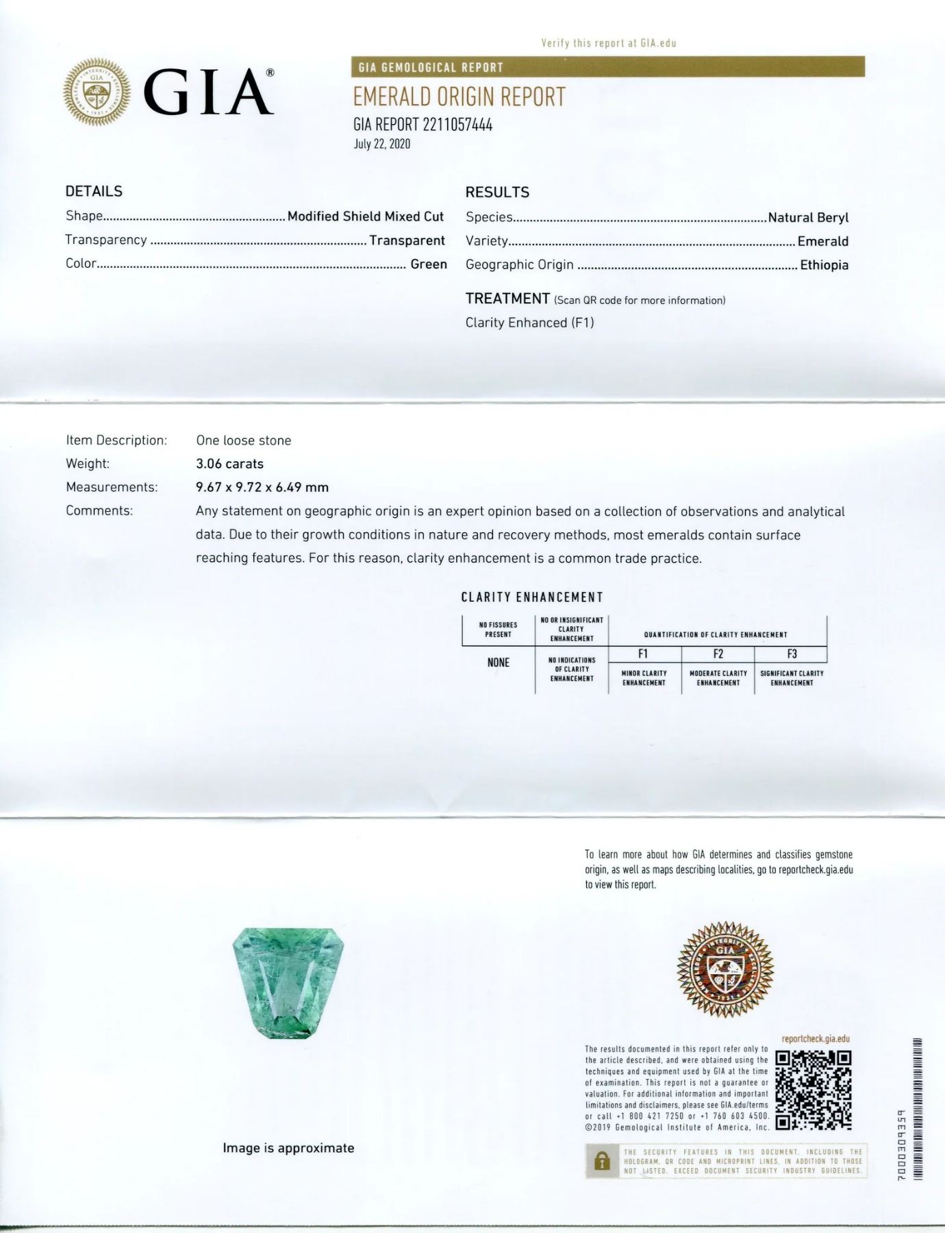 Stunning 3.06 Ct Green Emerald measuring 9.67 x 9.72 x 6.49 mm with a shield mixed cut. This unique gem displays a light tone. Get ready for the compliments on this one! Origin: Ethiopia. Please see the certification for additional information.
