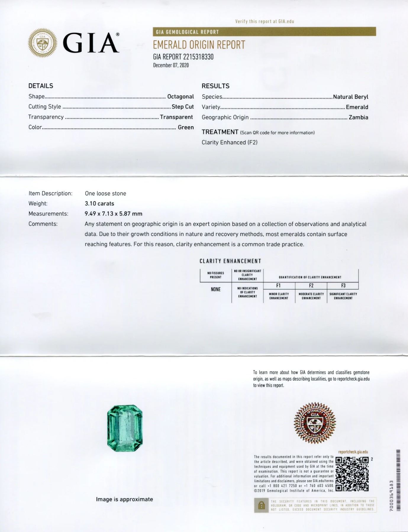 Pretty 3.1 Ct Green Emerald measuring 9.49 x 7.13 x 5.87 mm with an emerald cut. Displays a transparent green color that is breathtaking! Origin: Zambia. Please see the certification for additional information.