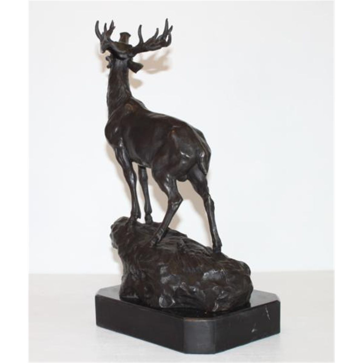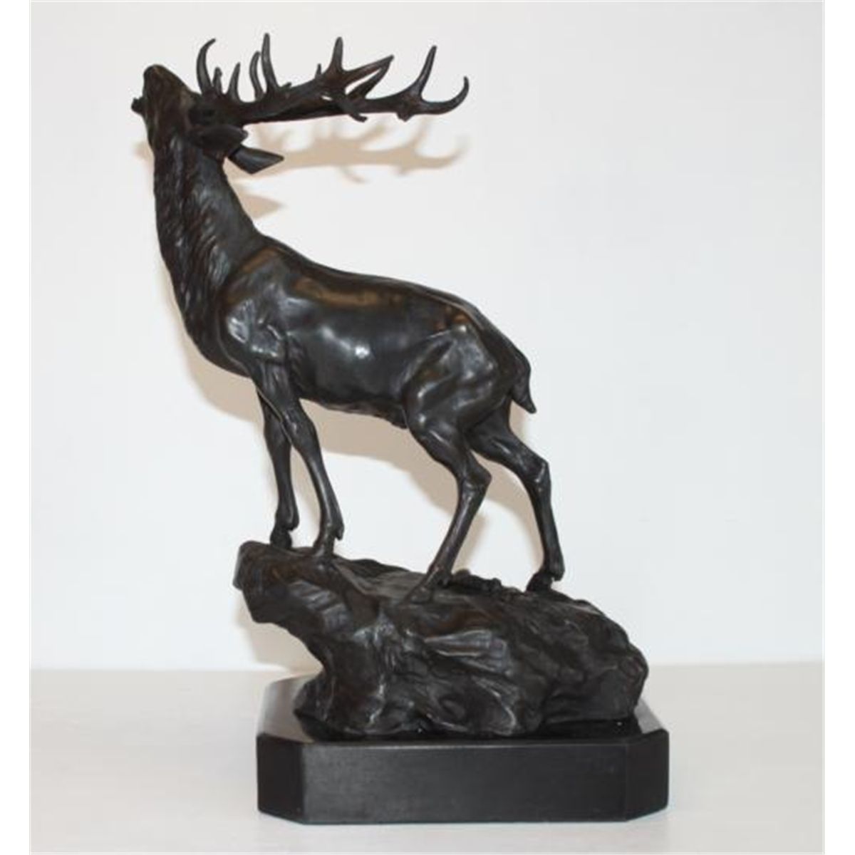 Single Standing Elk Bronze Sculpture, After PJ Mene, 15"H x 11"W x 9"D 17 lbs. This bronze sculpture was produced using the "Lost Wax" casting method. The"Lost Wax" Cast method is the most precise metal casting technique in existence, ensuring exquisite detail of the original host model which is usually sculpted in clay or wax. This "Lost Wax" casting method is an extremely labor intensive and expensive process, but the end results produce a Heirloom Quality Masterpiece!