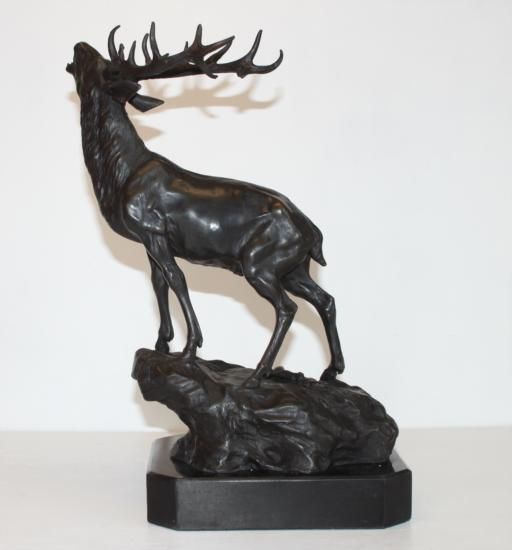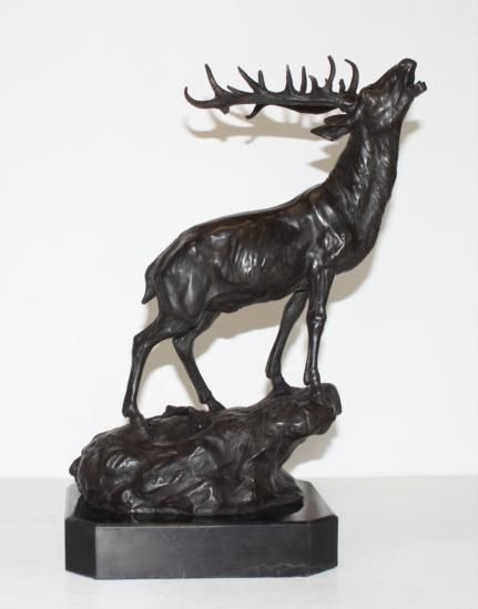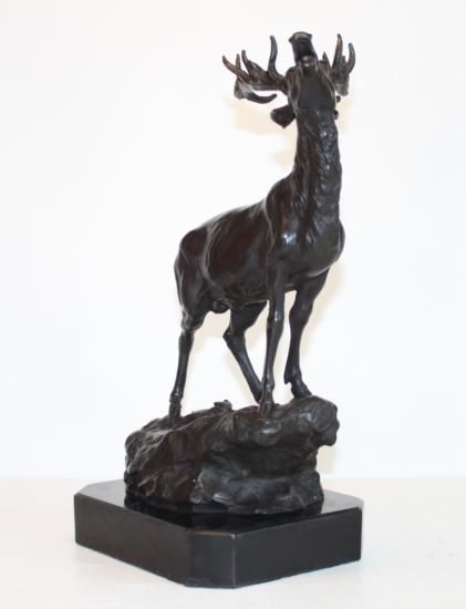 Single Standing Elk Bronze Sculpture, After PJ Mene, 15"H x 11"W x 9"D 17 lbs. This bronze sculpture was produced using the "Lost Wax" casting method. The"Lost Wax" Cast method is the most precise metal casting technique in existence, ensuring exquisite detail of the original host model which is usually sculpted in clay or wax. This "Lost Wax" casting method is an extremely labor intensive and expensive process, but the end results produce a Heirloom Quality Masterpiece!