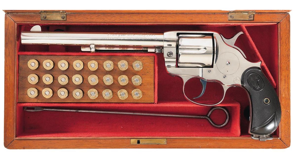 This is an outstanding example of a Colt Model 1878 Frontier Six Shooter revolver manufactured in 1896. The barrel has standard Colt one line Hartford address on the top and is stamped "COLT FRONTIER SIX SHOOTER .44-40" on the left side. "A FRIEND IN NEED/From your Wife. MAY 1908" is engraved on the barrel between the address and the model designation. The first and second lines of the inscription use different styles of engraving. The right rear trigger guard has the factory "six-pointed" rework star present. This was most likely added at the time of the aforementioned 1908 era factory inscription. The underside of the barrel is marked with the caliber designation "44" and the circled Rampant Colt is located on the left rear of the frame just in front of the grips. The full serial number "36/307" is located on the underside of the grip and the partial serial number "307" is stamped on the rear face of the cylinder. The rear of the loading gate is stamped "203". Nickel finish with niter blue trigger and hammer with polished sides, and a casehardened lanyard loop on the butt. Fitted with checkered hard rubber grips with the Rampant Colt in an oval at the top. The accompanying factory letter verifies the caliber ".44/c" caliber, barrel length, nickel finish, rubber grips and that it was shipped as 1 of 5 to Hartley & Graham in New York, New York on December 16, 1896. The revolver comes in a English style oak case with a varnished finish with an inlaid brass escutcheon on the lid. The interior is lined with red baize and divided into four compartments with a 24-round oak cartridge board containing 24 rounds of 44-40 cartridges and a steel cleaning rod.