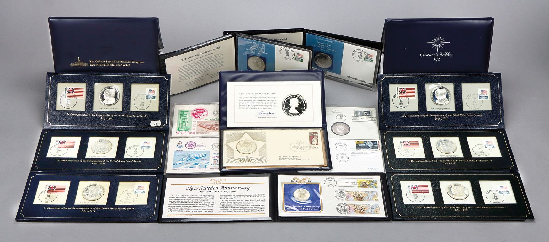 collection includes: (58) Postmasters Of America Medallic First Day Covers with Sterling Silver Medals (11) 1971 (4) 1972 (23) 1973, & (20) 1974 (6) 1971 Commemoration Of Inauguration of the U.S. Postal Service Sterling Silver Medals Covers (26) Official United Nations Commemorative Sterling Silver Medals, all but one with covers from 1970-1979 (2) 1970 Franklin Mint Dedication Medals W/ FDOI Cover; a 1938 New Sweden Silver Coin First Day Cover; a 1972 & 1973 Franklin Mint Christman in Bethlehem Proof Sterling Silver Medal (2); the 1975 Official Contentinental Congress Bicentennial Medal and Cachet; a 1964 JFK sterling medal cachet; a 1969 First Manned Moon Landing sterling medal cachet (2) Skylab sterling medals cachets: a 1973 Commonwealth Of the Bahamas sterling medal cachet; awesome lot for any dealer or collector (100+ items). Shipping charges apply - weight 22 lbs.