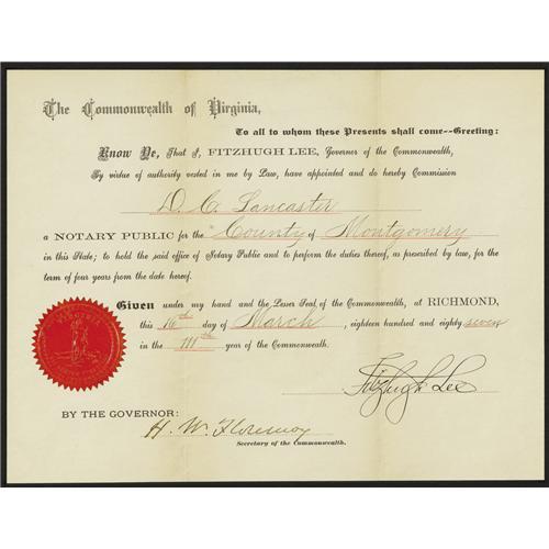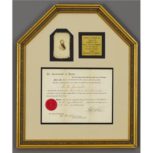 <B>Impressive Fitzhugh Lee Signature as Governor of Virginia with 1862 E. & H. Anthony Carte de Visite of Lee</B></I> Fitzhugh Lee, nephew of Robert E. Lee and Confederate Major General graduated from West Point in 1856. He would serve throughout the Civil War distinguishing himself as a gallant cavalry officer. While first serving as a Lieutenant Colonel under famed cavalryman General JEB Stuart, Lee became a legend in his own right rising to the rank of Major General and commanding the entire Confederate cavalry at war's end.<BR> Lee's storied military career carried him on to elective office rising to the Governor's office in Virginia in 1885 serving until 1889. This striking notary public's commission is signed with a flourish by the one-time Civil War hero. The 10 ½" x 8" document bears the bright red "Sic Semper Tyrannis" seal of the state of Virginia and is dated March 16, 1887. The large, bold signature is prominent at the bottom right of the document. The certificate appoints one '<I>D. C. Lancaster</B></I>' in Montgomery County, Virginia to a commission as a notary public.<BR>Nicely matted and framed, the document is in excellent condition with only paper folds evident. It is accompanied by a 2 ½" x 4" carte de visite of Fitzhugh Lee as a colonel in the Confederate army, just at the time he was riding with JEB Stuart. The photograph is by the famous E. & H. Anthony studios of New York and has been trimmed at the corners but in otherwise good condition. An engraved plaque decorates this custom-framed piece that documents the post-war activities of one the war's most famous generals.<BR><BR><b>Shipping:</b> Framed (<a target="_blank" href="http://www.heritageauctions.com/common/shipping.php">view shipping information</a>)