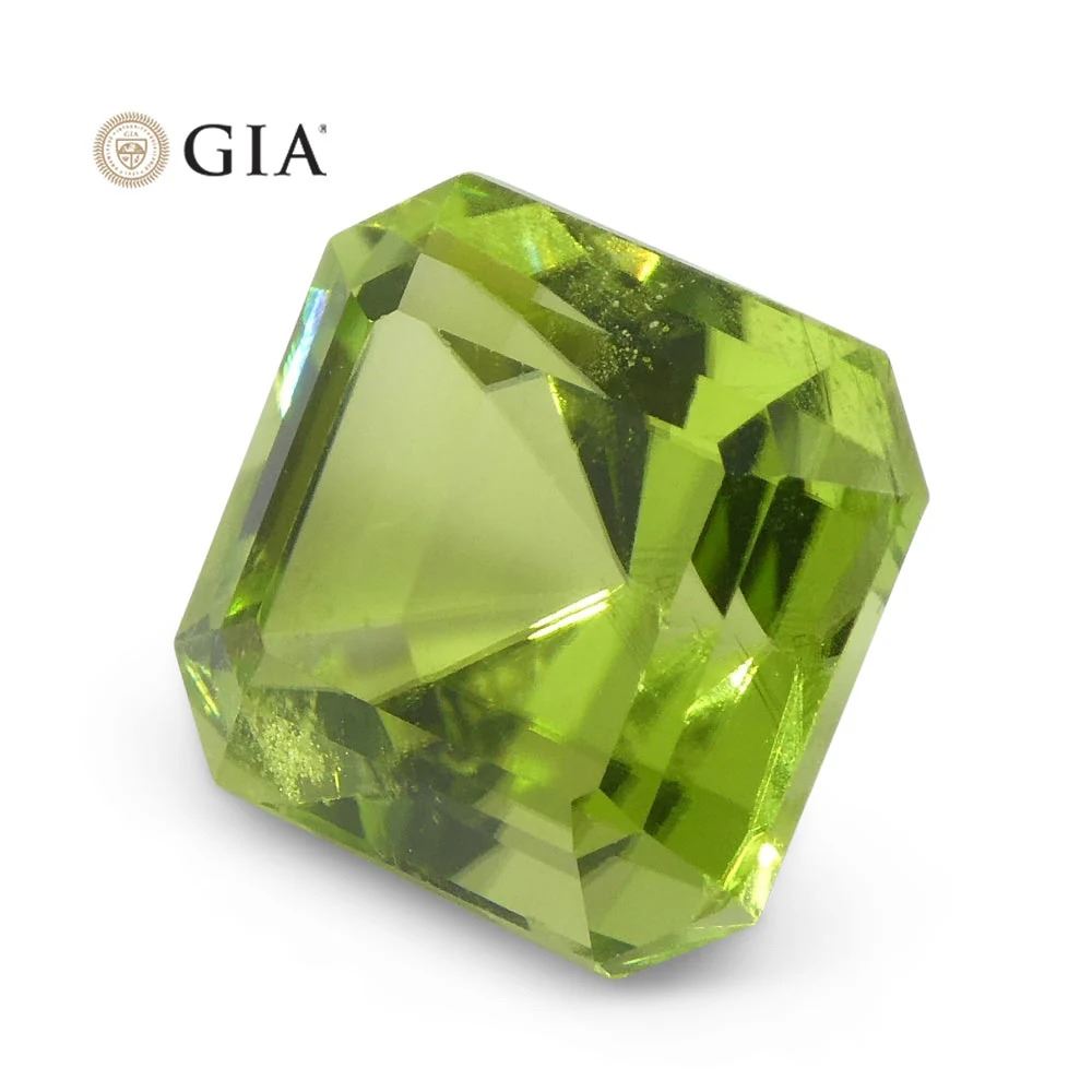 Gorgeous 6.64 Ct Yellowish Green Peridot is an emerald cut measuring 10.65 x 9.65 x 8.30 mm. The hue on this gemstone is absolutely beautiful! Treatment: None. Please see the certification for additional information.