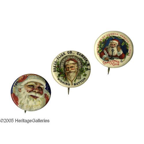 <B>Impressive Grouping of Santa Advertising</B></I> 1 1/4" celluloid pins each picturing a full color St. Nick. All three are in excellent condition, although without backpaper. The beautifully illustrated Santa and bold color would make anyone's eyes twinkle.
