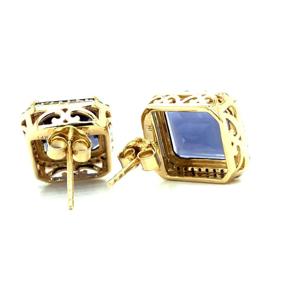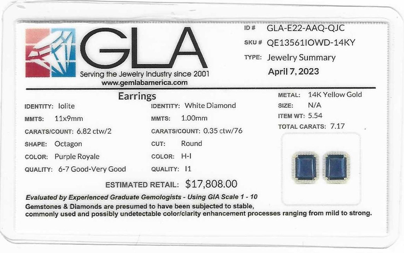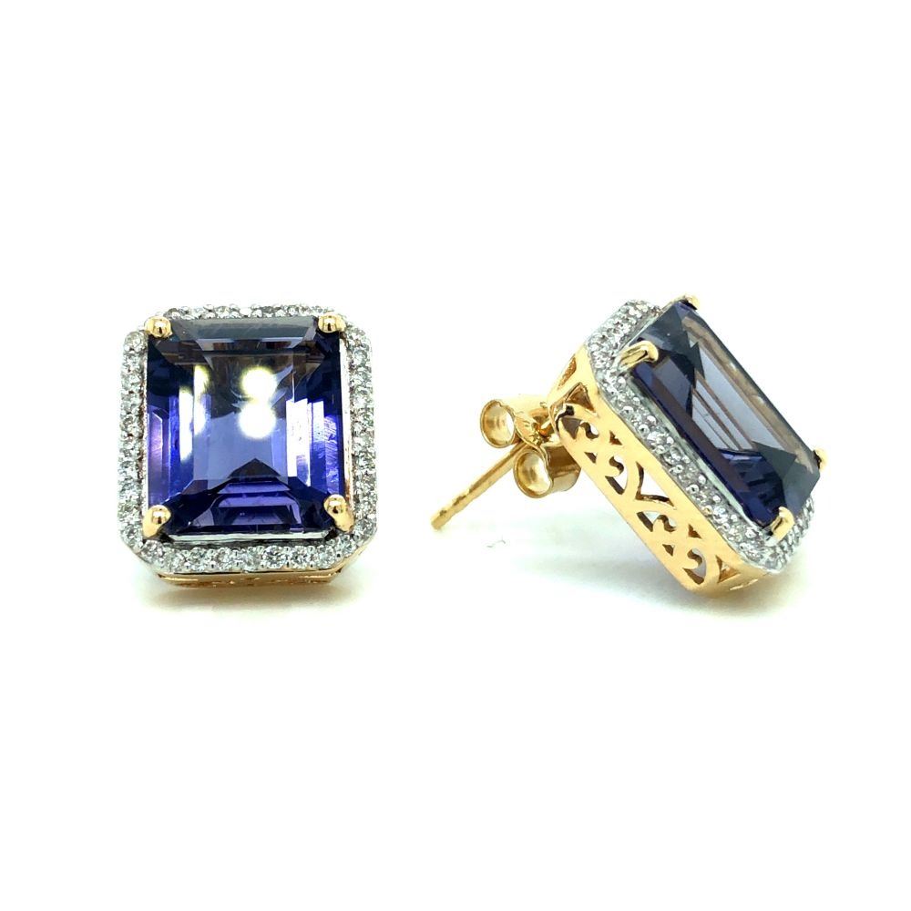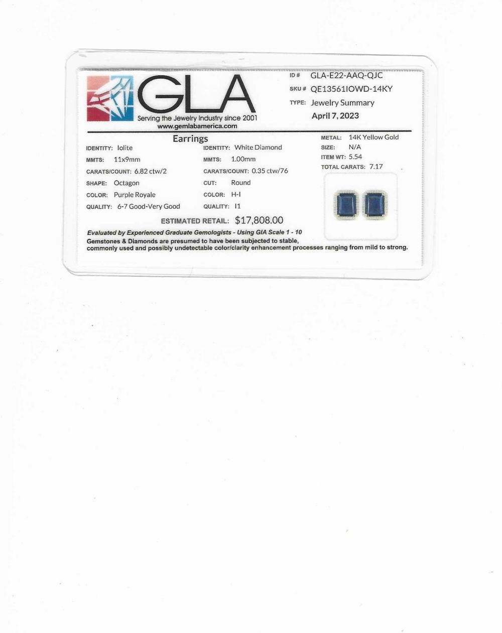 Genuine Iolite and Earth-Mined Diamond Earrings. Iolite is a gemstone with interested history. These 14 karat yellow gold earrings are set with a total of 6.82 carats of royal purplish-blue emerald-cut iolites and .35 carats round, brilliant-cut, H-I color, I1 clarity diamonds in the halo. The earrings are approximately 1/2& quot; by 3/8& quot; and attach to the earlobe with posts and friction backs. The gemstones are lifted up by ornate raised galleries. These earrings are certified and appraised for $17,808.00 estimated retail replacement value.