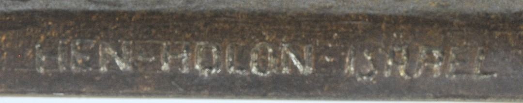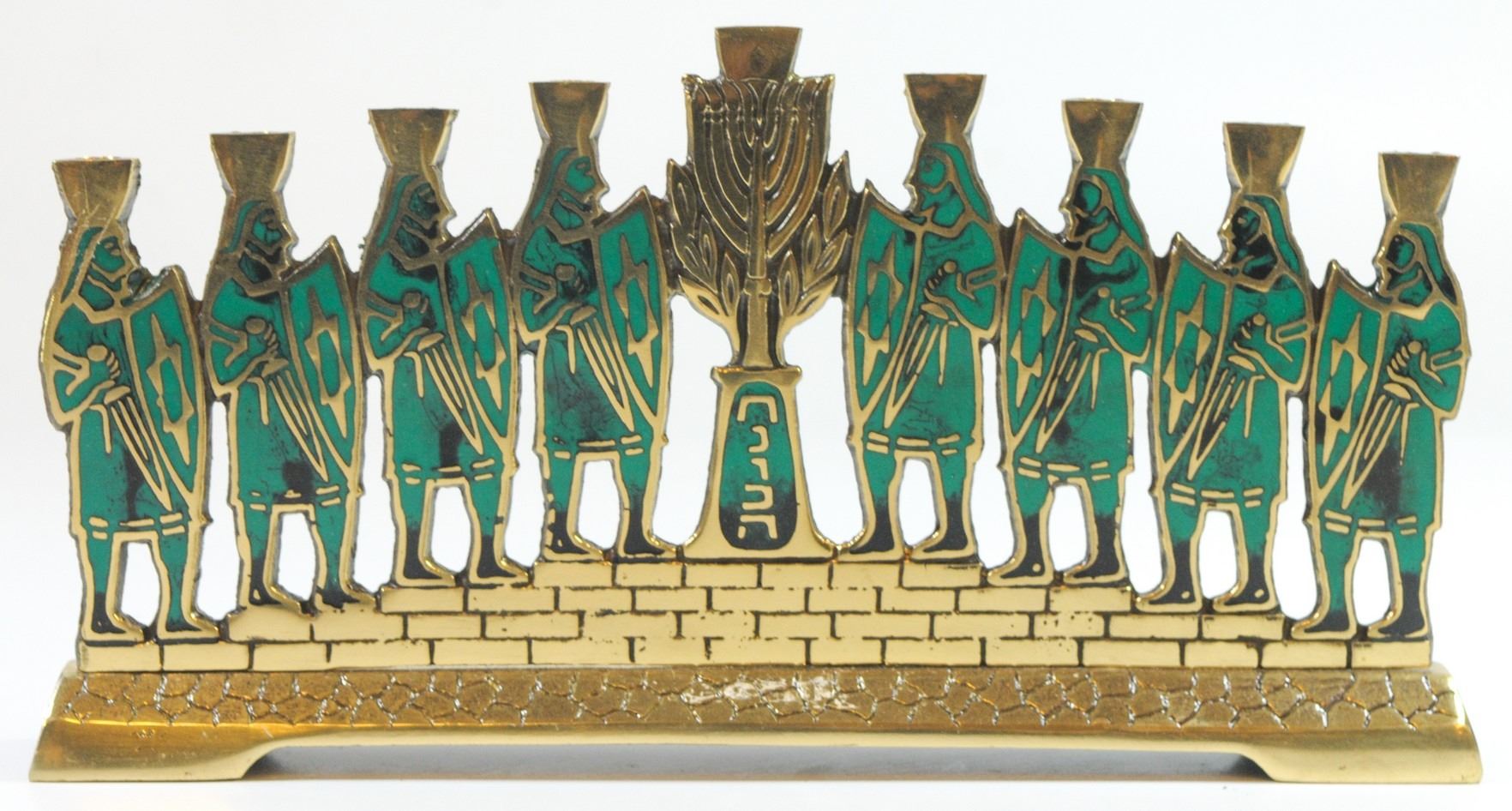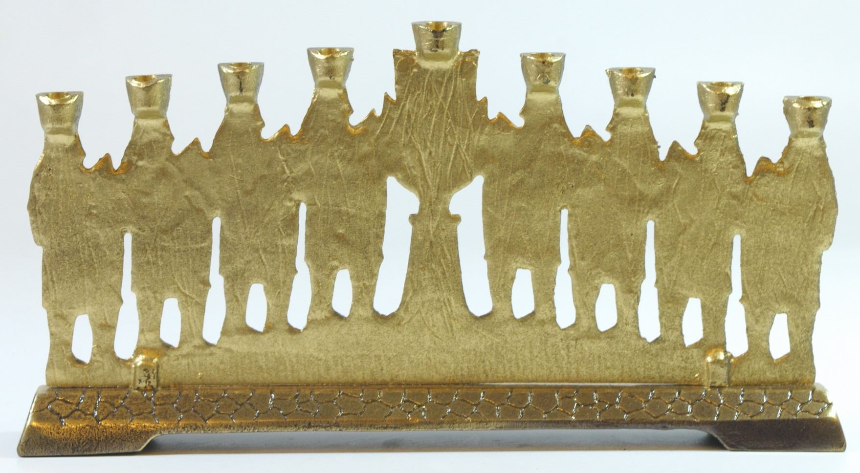 Impressive Israeli brass Hanukkah menorah lamp by Chen Holon, circa 1960s, the Maccabees, decorated with green patina, in very good condition, almost new! Signed, length: 27 cm.