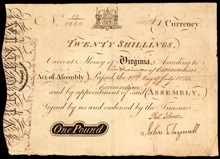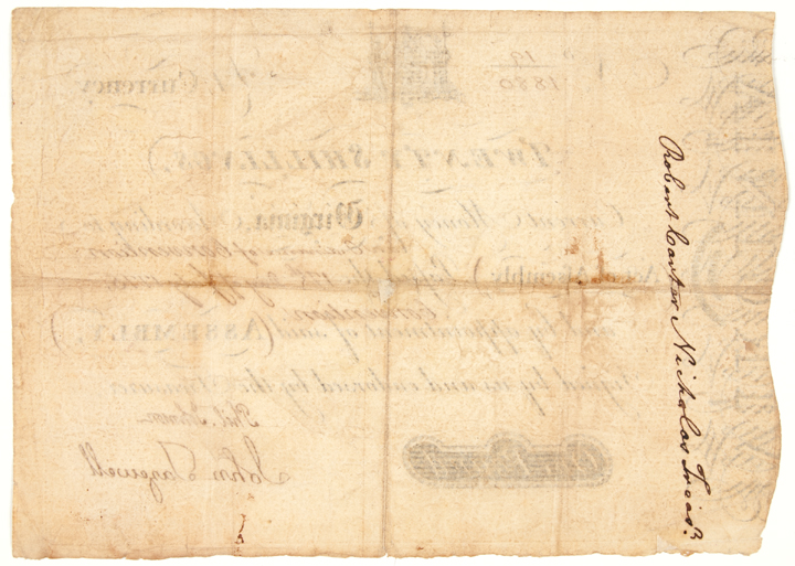 Fr. VA-77b. This is a pleasing Large Format, John Ashby engraved bank form, signed within the left margin print by the engraver “Ashby.” This note has a large portion of its left side indent margin is still intact. Much of the word “VIRGINIA’ is still present and ‘DEATH TO COUNTERFEIT” remains full. There are some typical light folds and a tiny central paper reinforcement on the reverse. The printed text is sharp and fully readable and the manuscript portions are written in bold brown. Endorsement on the blank reverse of “Robert Carter Nicholas Treas.” recording this note as the Treasurer of Virginia.