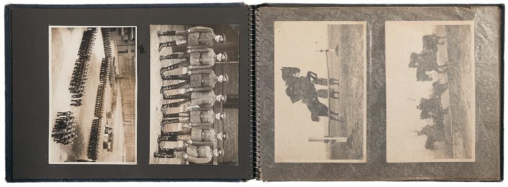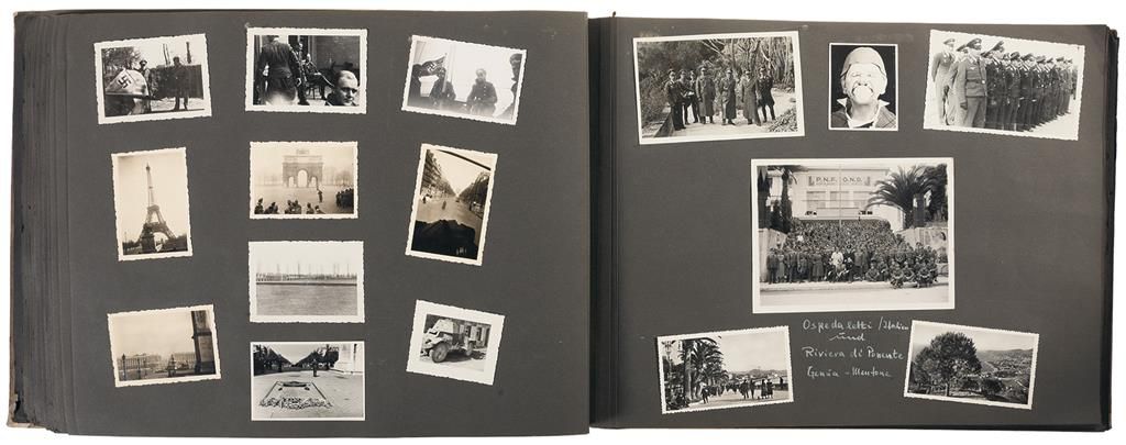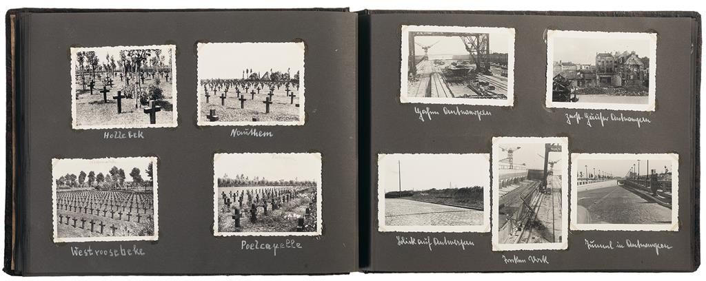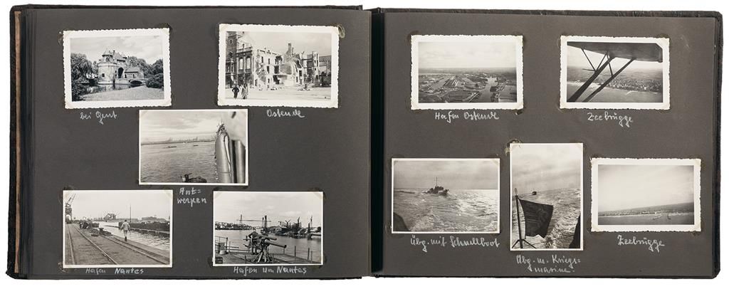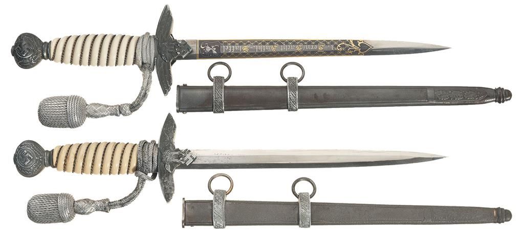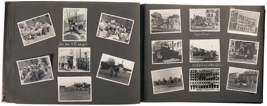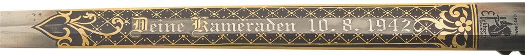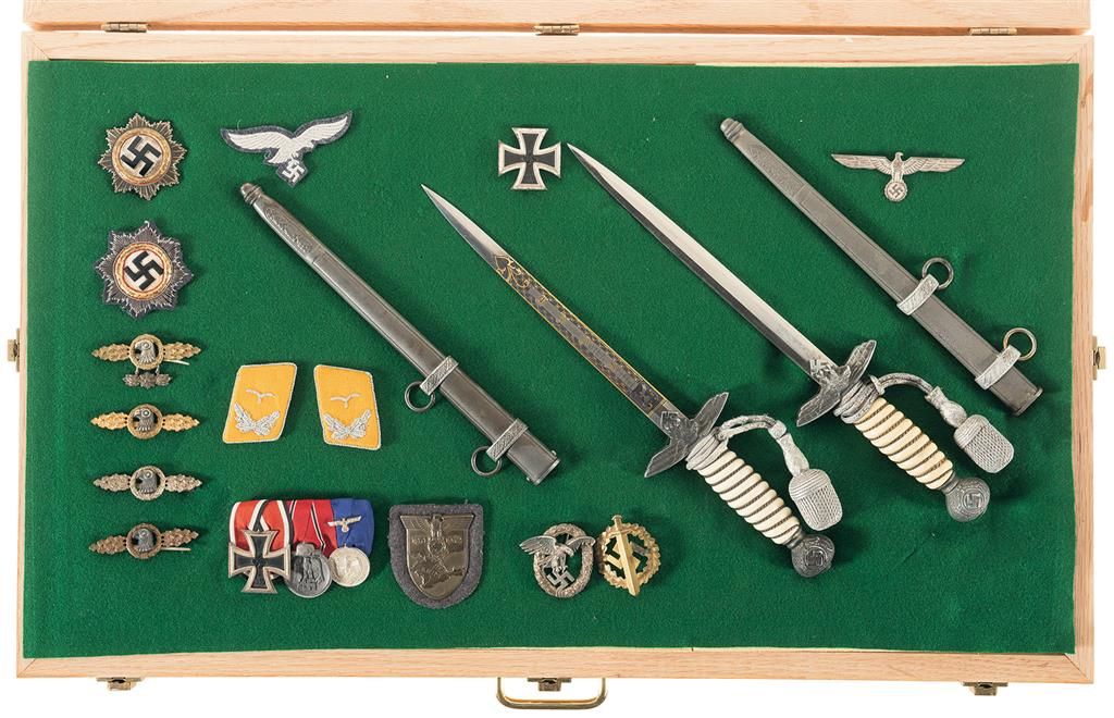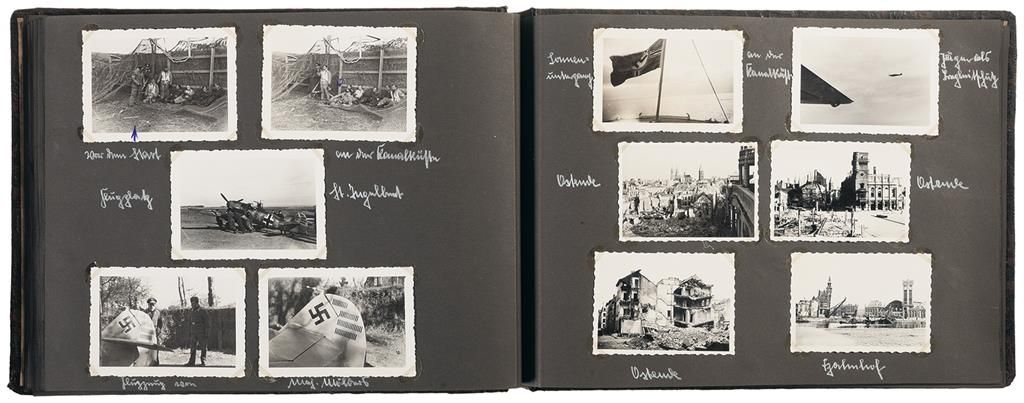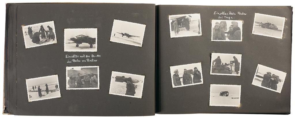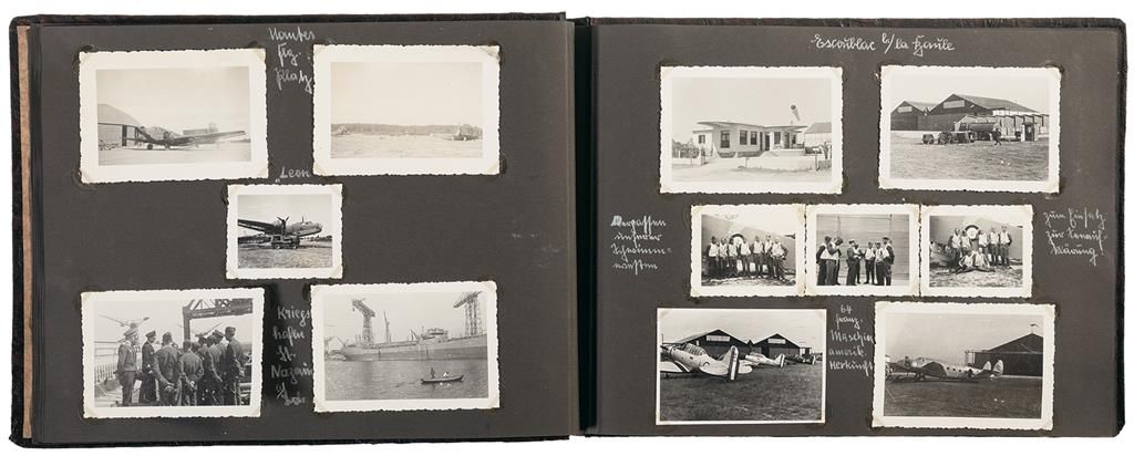 According to information supplied by previous owners, the contents of this lot were the wartime property of one Fritz Edelhoff. Starting his military career with the 4th Mounted Batallion of the 3rd Prussian Artillery Regiment as a Kanonier (a Private), Edelhoff transferred to the Luftwaffe, logging his first fight on June 7th, 1939 in a Junkers Ju 52 multi-engined transport/bomber. His career would last through the very end of the war, seeing him rise through the enlisted ranks to become an officer in his own right, earning a wide cross section of German awards in the process. The cornerstone of the grouping is a wood bodied, glass topped display case, which holds the following items. 1) Eickhorn Presentation Luftwaffe Dagger, 15 1/2 inches overall. The 10 inch blade is blue and gilt, with "1.Fern/Nacht Aufkl.-Staffel" and a unit insignia of an angel holding a candle while riding across the night sky on a telescope on the obverse, and "Deine Kameraden 10.8.1942" above the Eickhorn Squirrel on the reverse. Darkened alloy fittings, with a wire wrapped white celluloid grip, silver portapee, and proper scabbard. 2) Presentation Etched Luftwaffe Style Dagger, 15 1/4 long with a 10 inch blade marked "LEUTNANT FRITZ EDELHOFF 1./(F) NACHT AUFKLARUNGSSTAFFEL" on the obverse, with alloy fittings, silver portapee, wire wrapped white celluloid grip, and alloy scabbard. 3) An assortment of Luftwaffe/Nazi items, including the Iron Cross in Second and First Class, the Reconnaissance Badge in bronze, silver, gold, and gold with pendant, the "Krim" campaign patch, the medal and patch for the German Cross in Gold, Pilot's Badge, Sport Badge, Nazi cap eagle, Luftwaffe Cloth Eagle, Wehrmacht Service Medal with "4" on the back, Eastern Front Winter Campaign Medal and a pair of silver bullion/yellow waffenfarbe collar tabs for a Leutnant. Also included with the lot are six separate items from the Leutnant, as follows. 4) Two "Flugbuch" flight logs for Leutnant Edelhoff, covering a period from 1939 to 1945, with 701 flights listed. Edelhoff spent most of his listed flights in Dornier Do 217 and Heinkel He 111 aircraft, though a number of other craft are listed. The final listed flight is May 7, 1945, 8:00 PM to 9:05 PM, Koeniggraz (now Hradec Kralove, Poland) to Graz, Austria, with the surrender instrument for Nazi Germany signed by Admiral Doenitz the next day. 5) Four wartime Nazi photo albums of Lt. Edelhoff, covering the period from his enlistment as an artilleryman through his career as an aviator. The photos within cover a wide cross section of the war, with photographs of his unit both in formation and at times of leisure, natural and urban landscapes in a variety of conditions, including post bombardment, photographs of assorted Luftwaffe aircraft on the ground, in the air, and post-crash, and others. In some of the pictures, Edelhoff has been explicitly pointed out.
