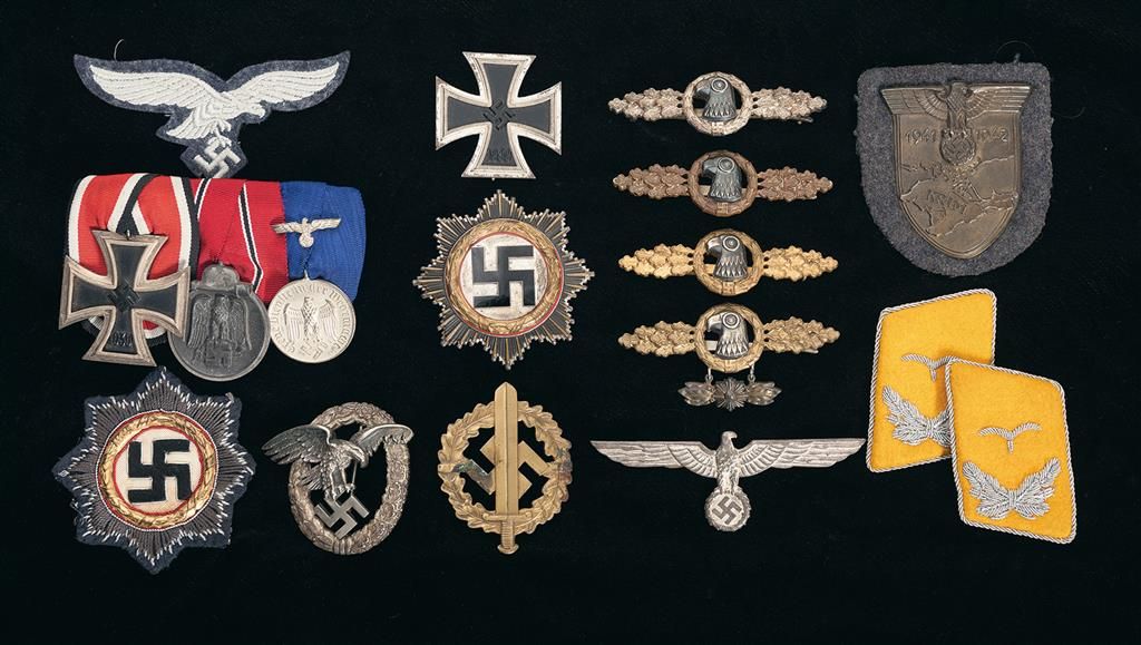 1) Excellent, with some fraying of the portapee and mild wear overall. The gild and blue finishes are both excellent. 2) Fair, with pitting and polishing/sharpening marks on the blade, mild handing marks overall. 3) Good overall. The Pilot Badge shows some bends in the swastika. 4) Very good, with some mild foxing and stains. 5) Very good. Some of the pictures have been dismounted on their backings, and some mild handling marks and wear are visible overall. A superb grouping of Heer and Luftwaffe memorabilia.