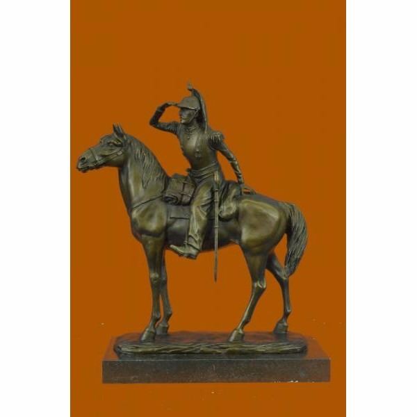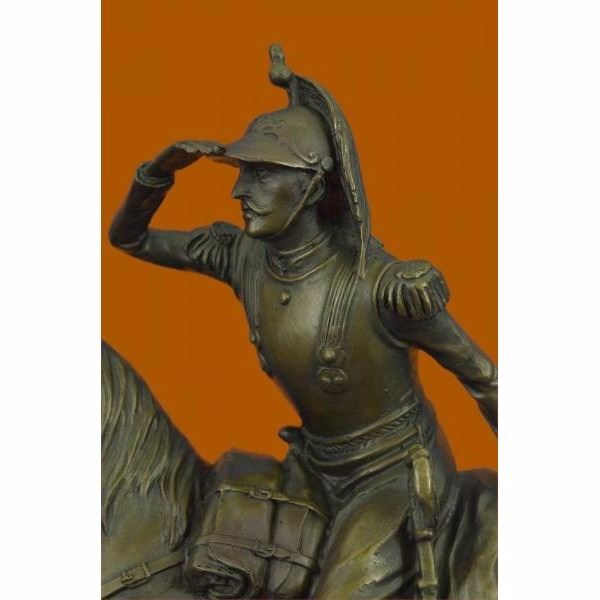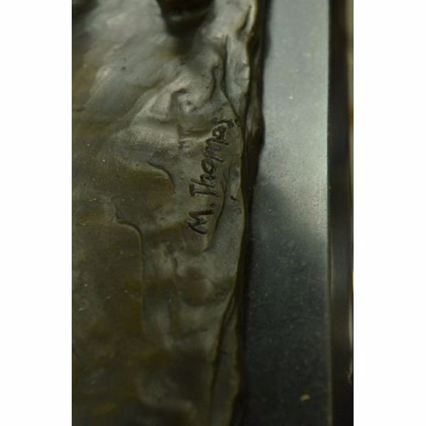 An impressive mid century Century bronze study of a French cavalryman seated upon his horse dressed in steel cuirass Armour and plumed steel helmet, looking into the distance. The bronze with excellent detail and rich brown patina. Signed Math Thomas Condition: This sculpture is in perfect condition. Bronze Dimensions with Marble Base:Height 15" X Width 12" Marble Dimensions: 11" X 5" Height without base: 14" Weight : 17 LBS Inventory : 89STE33599598