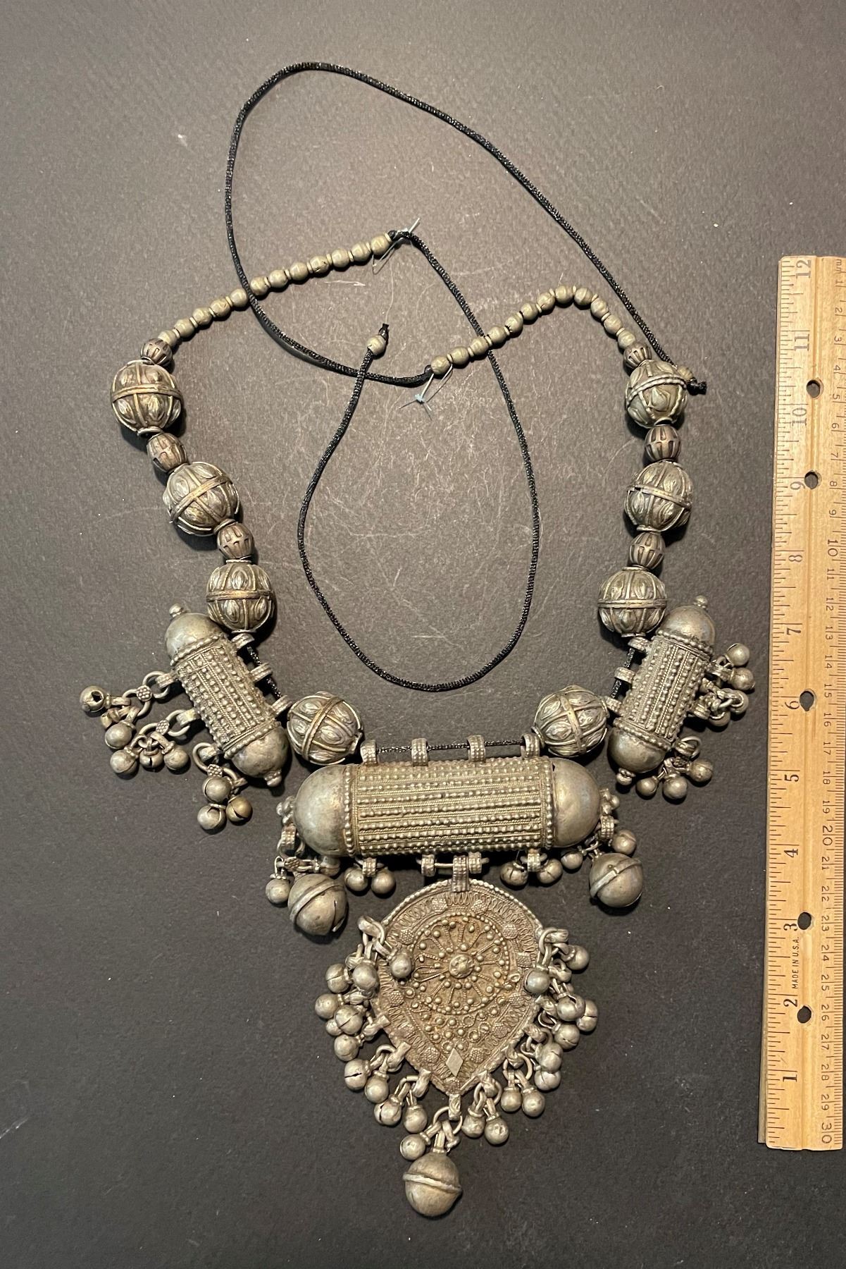 Description: An entire necklace of hollow silver beads and pendants, with inverted teardrop-shaped plaque, lavishly decorated. Impressive!