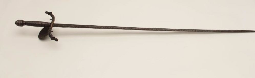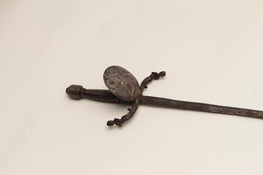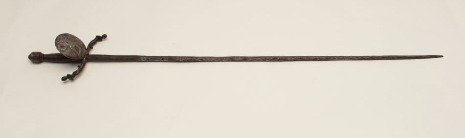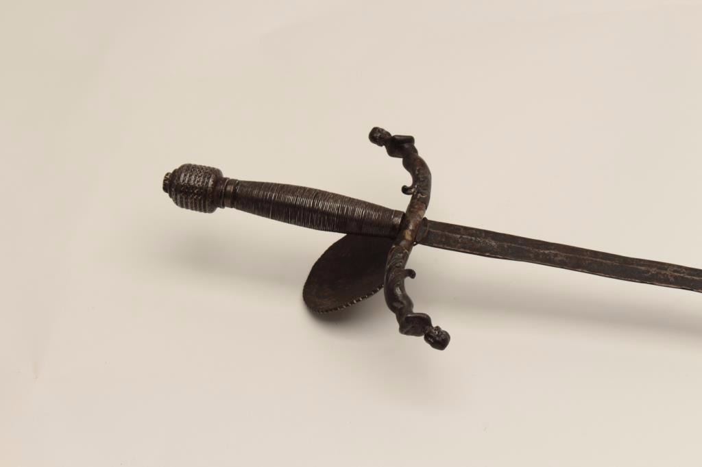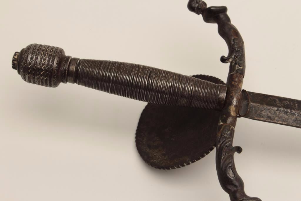 Impressive and ornate rapier with 17h and 19th century associated elements. The rapier show a 39” wide blade and is 46” overall. The blade is genuine and shows wear and pitting. The guard shows Roman figures in relief andis fine work. The quilons are cast in figures or mermaid and cleverly added to original guard. Wire wrapped grip and decorated pommel. Very Attractive! Est.: $900-$1800