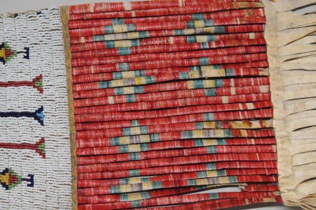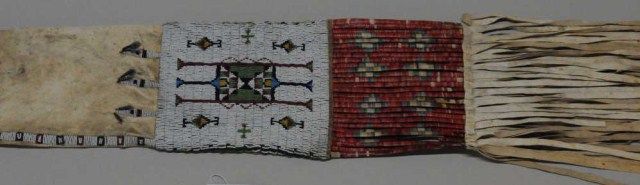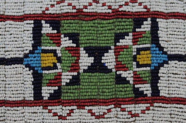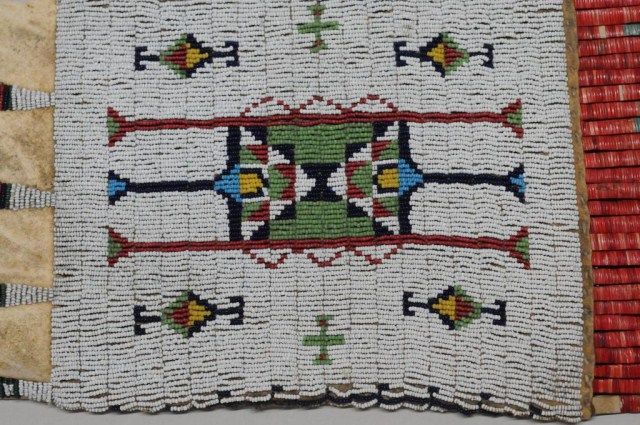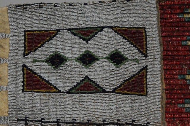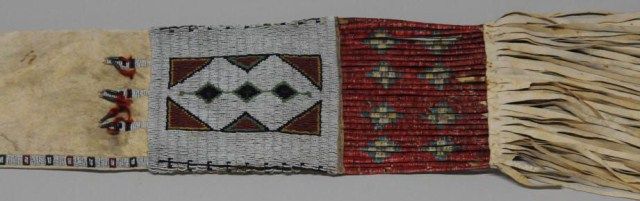 Impressive beaded and quilled Indian pipe bag approx. 36” overall and approx. 8” wide in overall very good condition showing an approx. 10” beaded panel on both sides of the bag with geometric designs of white, red,green, purple and greasy yellow seed beads; additional bead trim along the upper portion of the bag and three small beaded stalks on each side at the top of the panels with tin cone accenting; lower portion of bag showsmulti-color quill work with some slight losses and fringed hide strips extending from the quillwork; beadwork is sinew sown and artfully accomplished; appears to be Dakota Sioux. Est.: $1,250-$2,500.
