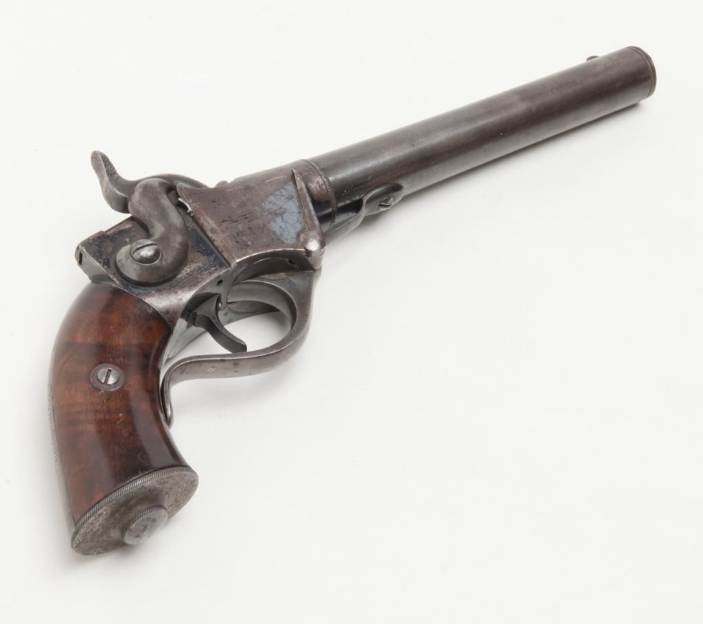 Impressive cased Sharps Breech-Loading Single Shot pistol, Second Type, .36 cal., 6-1/2” round barrel, blue finish, wood grips, backstrap period inscribed “I.M. Graham from his friends 1861”, #595 in overall very good to fine conditionshowing approx. 35% original blue finish on the frame and considerable muted original blue finish on the barrel, crisp action, sharp markings, overall good bore with some spots of erosion; fine grips with period initials “IMG” engraved on topof the left grip. The custom wood case is in overall very good condition circa 1950’s and beautifully constructed with compartments for the gun, a period plain brass flask, wood cleaning rod, Eley Bros. cap tin, original combinationtool, misc. lead balls and a key that works the lock of the case. This is the only period inscribed Sharps single shot pistol we have encountered and the inscription is definitely period and may be researchable; only approx. 350Second Types were manufactured between 1854 and 1857; the casing is expertly made; originally from an old collection and given the date of presentation, may have a Civil War association. Also accompanying this lot is a 1991 appraisal