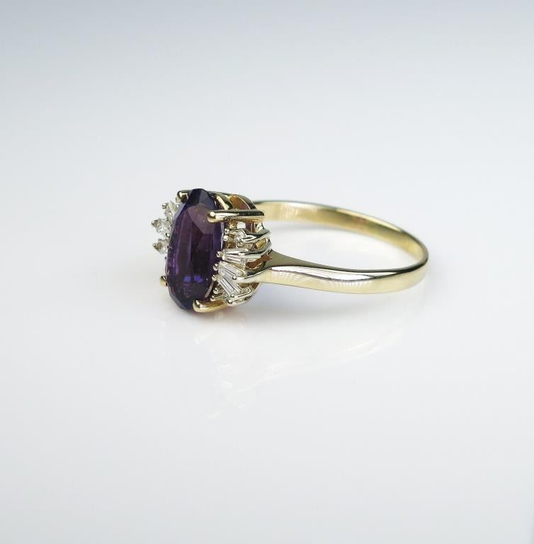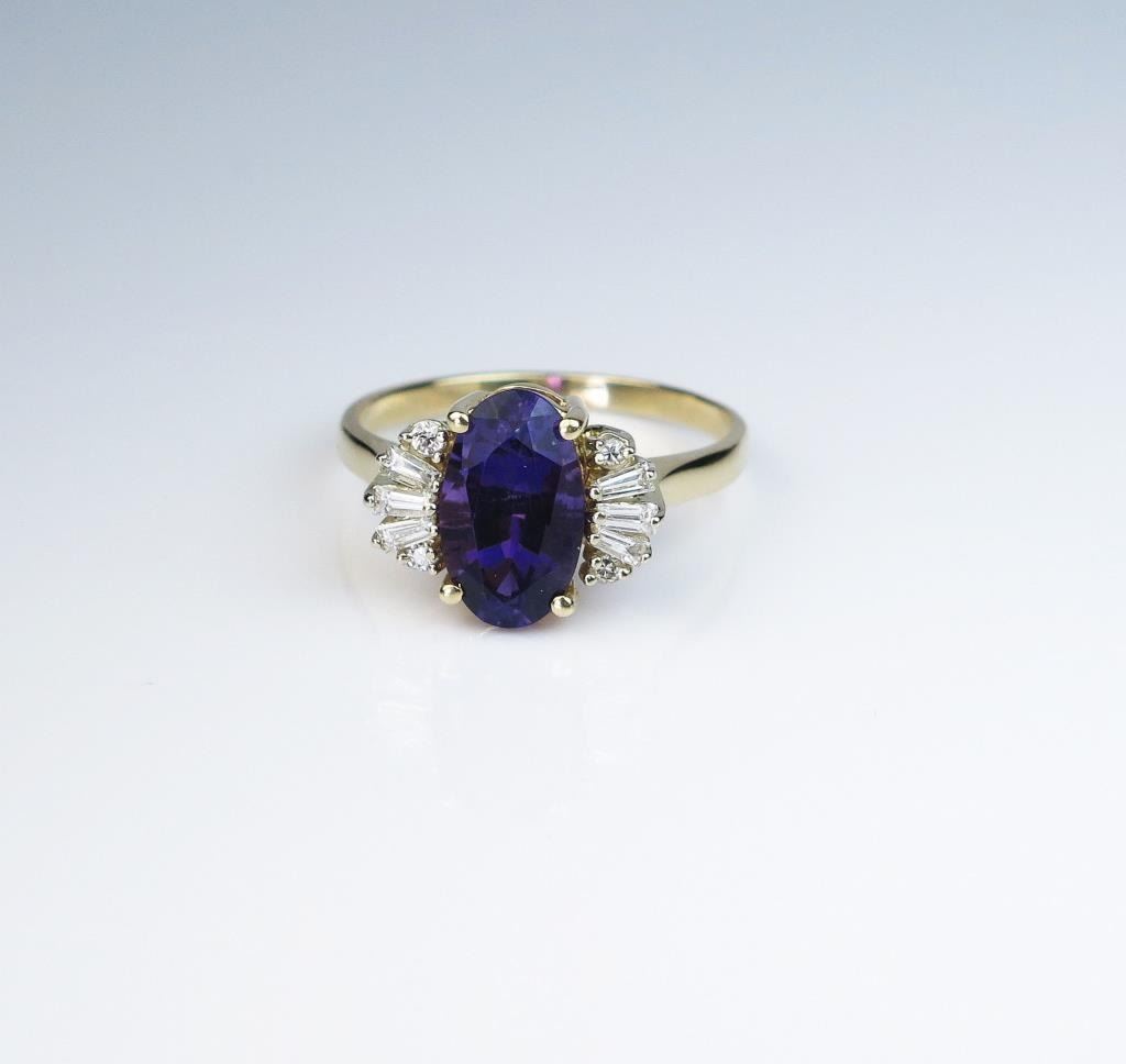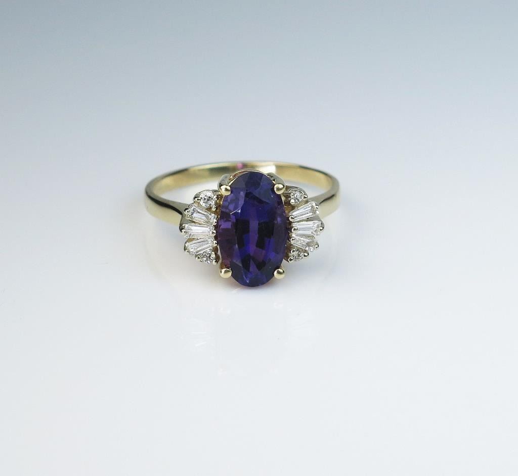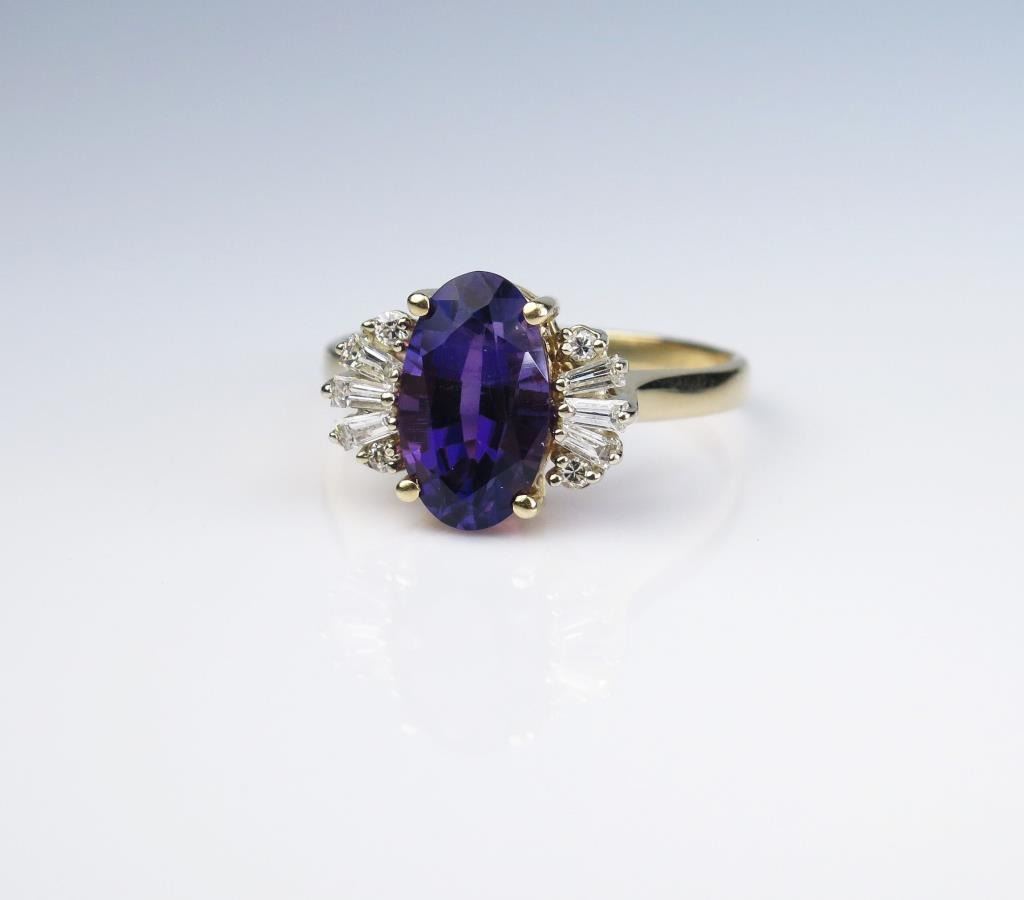 weighing approx. 4.00 carats and surrounded by 10 round and baguette cut diamonds weighing approx.. 0.50 carats of F-G colors and VS clarity set in a 14 karat yellow gold setting. Retail $2,000-$3,000 Estimates $1,200-$1,800