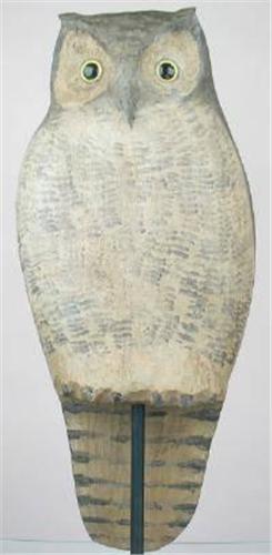 Impressive larger than life size great horned owl carving by Frank Finney, noted Virginia folk artis. In XOC. Glass eyes and a claw type beak. (decoy)