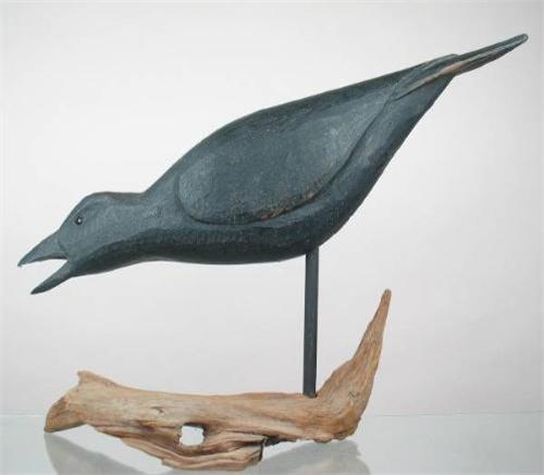 Impressive oversized open beak crow carving by noted carver Grayson Chesser, Jenkins Bridge, VA. Wing carving detail and glass eyes. Surface black paint is antiqued. Tight check in the top of the body. XOP, typical "C" impressed into the bottom below the stick hole. (decoy)