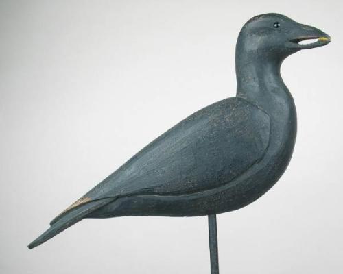 Impressive upright oversized open beak crow carving by noted carver Grayson Chesser, Jenkins Bridge, VA. Wing carving detail and glass eyes. Surface black paint is antiqued. Beak is holding a kernel of corn and has a small ding on the underside. In XOP, typical Chesser brand "C" impressed into the bottom below the stick hole. (decoy)