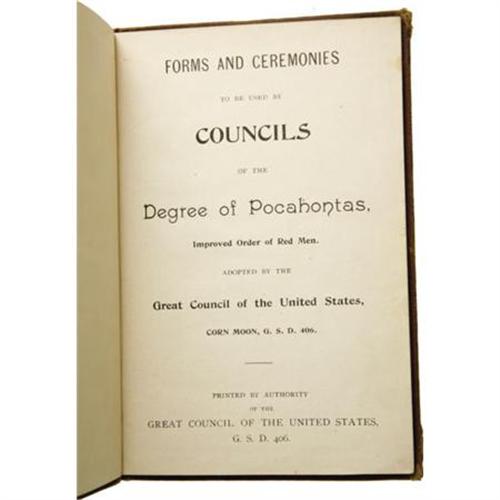 <B><I>mproved Order of Red Men . <I>Forms and Ceremonies to be used by Councils of the Degree of Pocahontas, Improved Order of Red Men.</B></I></B></I> Adopted by the Great Council of the United States, Corn Moon, G.S.D. 406 ie. September 1898 . ( N.p.: Great Council of the Unted States, G.S.D. 406 ie. 1898 ). First edition thus. Octavo (6.75” x 4.5”). 34 pages. Original brown cloth. General light wear and rubbing to the binding, holograph list of month names mounted to rear pastedown endpaper, paper lightly soiled and browned, else a very good example. The Improved Order of the Red Men is a fraternal, social, insurance and political organization founded in the late 18th or early 19th century. The Degree of Pocahontas is the female auxiliary.<BR><BR><b>Shipping:</b> Books & Catalogs (<a target="_blank" href="http://www.heritageauctions.com/common/shipping.php">view shipping information</a>)