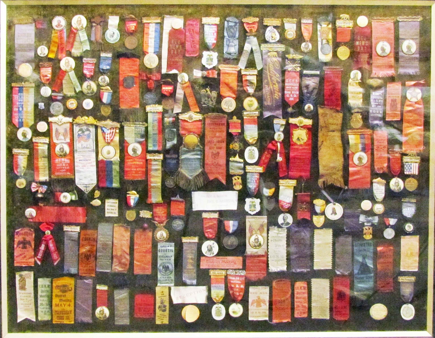 Improved Order of Red Men Ribbon/Badge Display. Badges, Ribbons, Buttons, Souvenirs and Delegates. Cross country collection. Various conditions. Shadow box measures 60 X 49 inches.