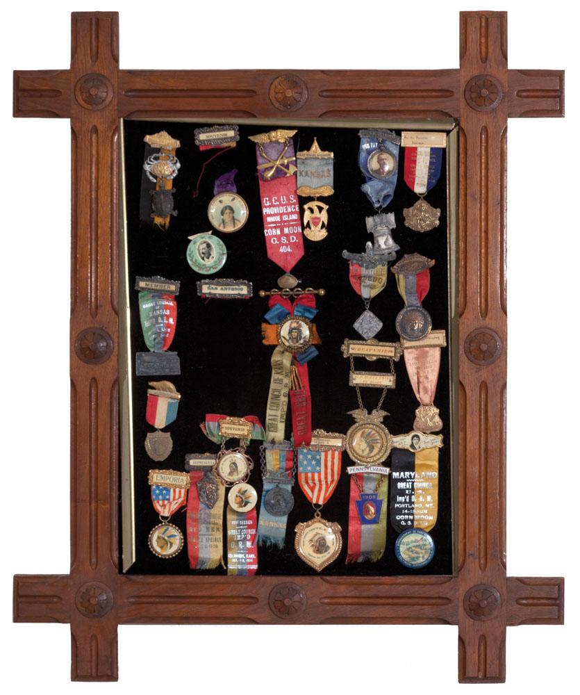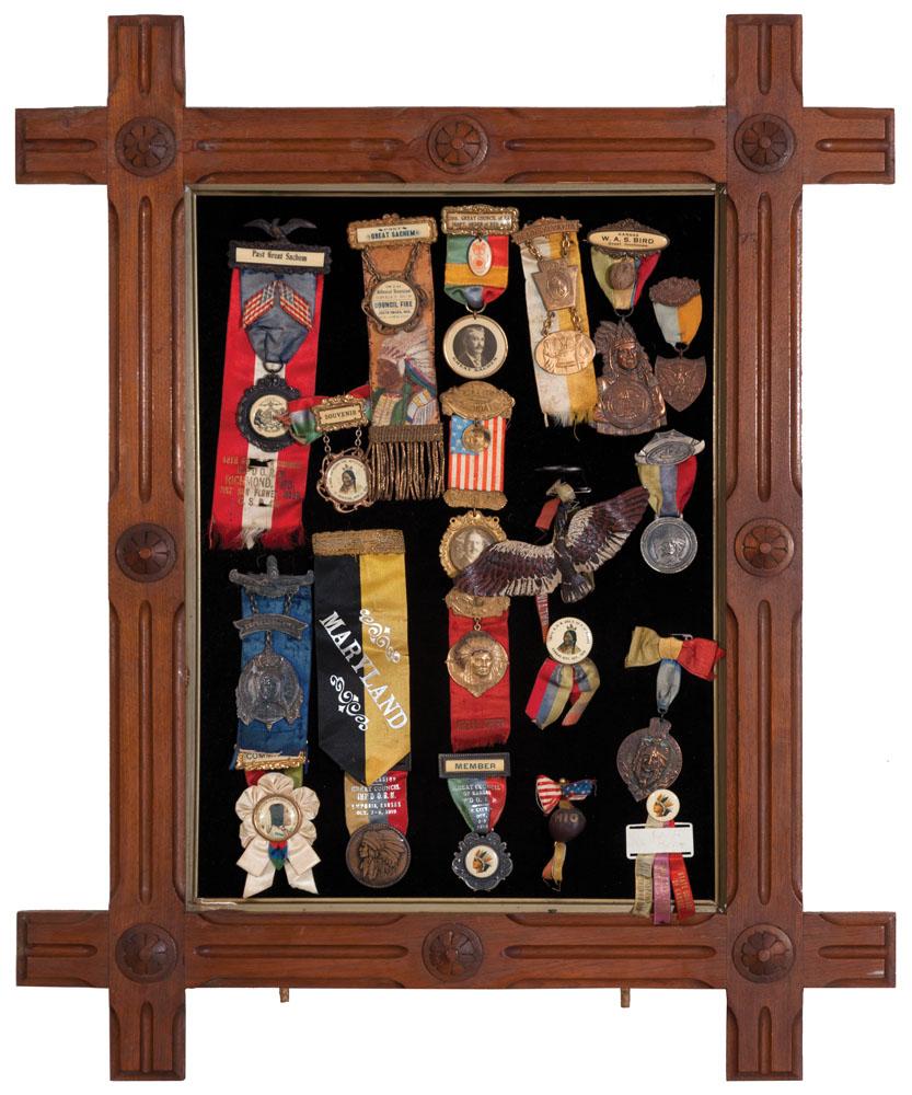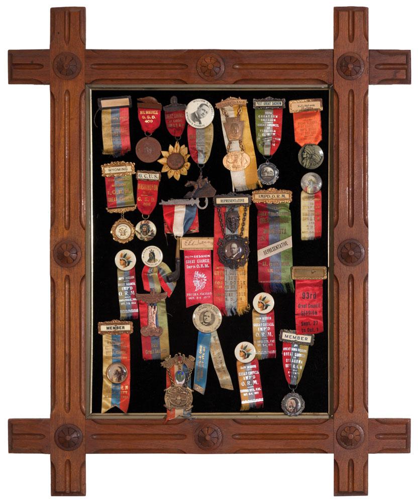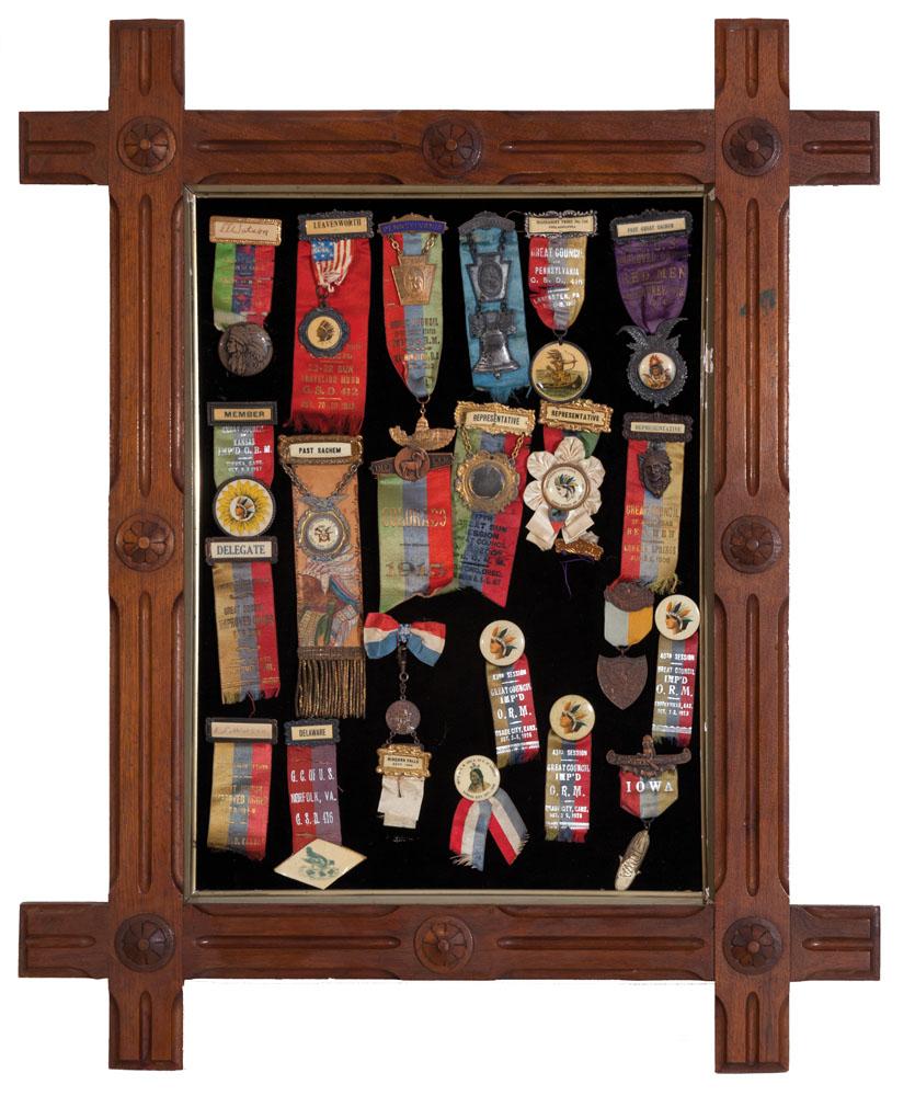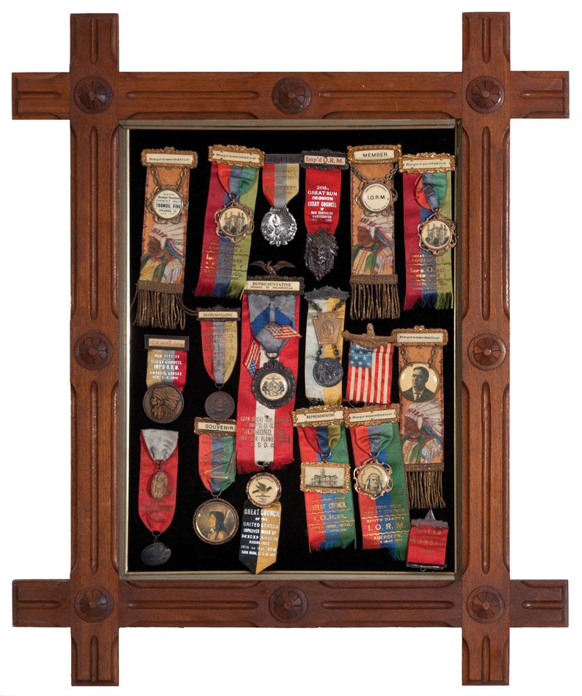 Grouping of 5 carved oak frames containing badges, ribbons, suspension medals from the organization Imp’d O.R.M., T.O.T.E., celluloid, brass, paper, leather, all manner of decorative ribbons and badges. Includes: Past Great Sachem, Cheyenne, Aberdeen, Emporia, Baton Rouge, Coffeyville, Fort Smith, Osage City, Oklahoma City, San Antonio. Starting from 1903, approximately 107 pieces, some very rare and decorative pieces. Most likely a lodge display, various conditions, some missing pieces.