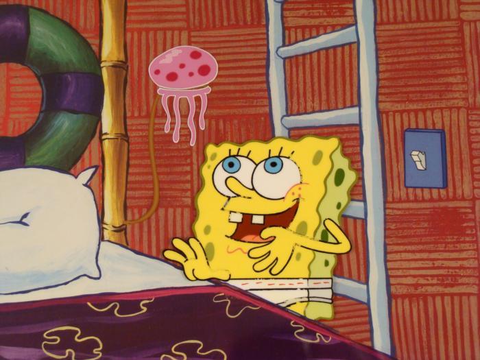 This original animation cel and reproduction background is from the Nickelodeon TV show SpongeBob Squarepants. The story takes place under the deep blue sea in Bikini Bottom, where SpongeBob resides. SpongeBob, who is a yellow, porous sponge, is your typical happy-go-lucky character, as he is always cheerful and enjoys making people laugh. Patrick Star, SpongeBob's neighbor who is a starfish, is your average children's show idiot, as he boasts knowing nothing and is often getting himself into ridiculous situations. Between the homes of these two lies the home of the miserable Squidward, a squid, who is known for being grouchy and playing tricks on SpongeBob and Patrick. Both SpongeBob and Squidward work at the Krusty Krab, a fast food business run by the greedy money-loving Mr. Krabs, a crab, the arch rival of the evil, possibly misunderstood, Plankton. Another neighbor, Sandy Cheeks, an athletic squirrel who normally wears an astronaut's space suit, was introduced in "Tea at the Treedome." She spends most of her time inventing and experimenting. Spongebob seems to be in awe of this floating jellyfishOriginal Production Animated Cel Reproduction Background Overall Size of Background: 11" x 17" Overall Size of the Cels: 10 1/2" x 12 1/2" Very good conditionThis is an original hand-painted cel set-up used in the production of an episode of "SpongeBob SquarePants." Each one-of-a-kind set-up represents a slight change in position of the characters. When individually photographed and projected in rapid succession, the images appear to move.