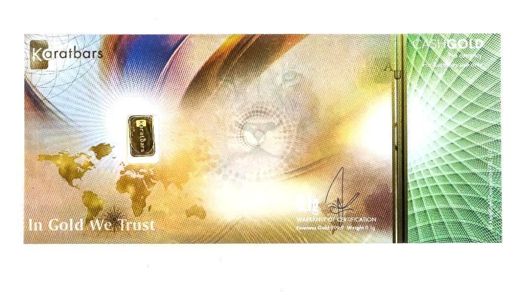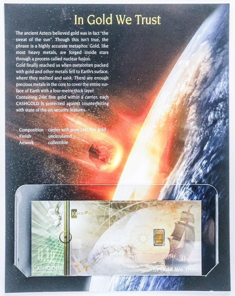 In Gold We Trust - 24kt .9999 Fine Gold Wafer Within a Carrier on a Giclee Art Card Display. CASHGOLD