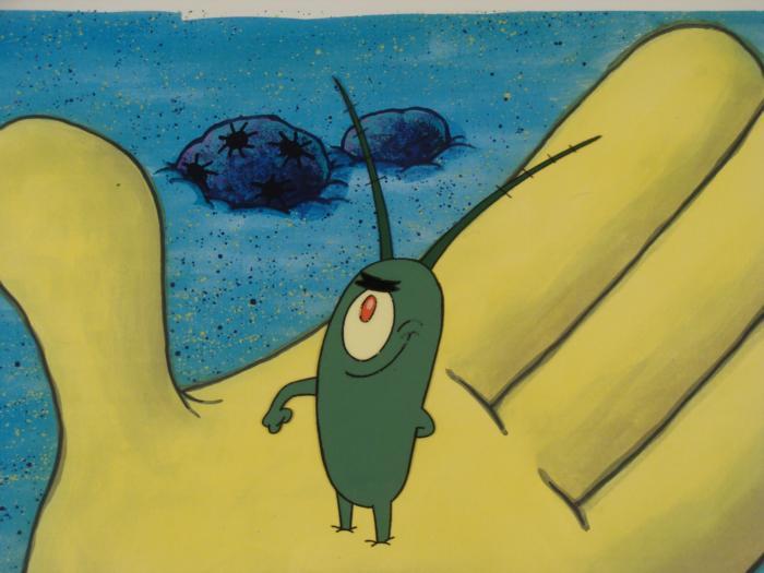 This original hand-painted background and animation cel are from the Nickelodeon TV show SpongeBob Squarepants. The story takes place under the deep blue sea in Bikini Bottom, where SpongeBob resides. SpongeBob, who is a yellow, porous sponge, is your typical happy-go-lucky character, as he is always cheerful and enjoys making people laugh. Patrick Star, SpongeBob's neighbor who is a starfish, is your average children's show idiot, as he boasts knowing nothing and is often getting himself into ridiculous situations. Between the homes of these two lies the home of the miserable Squidward, a squid, who is known for being grouchy and playing tricks on SpongeBob and Patrick. Both SpongeBob and Squidward work at the Krusty Krab, a fast food business run by the greedy money-loving Mr. Krabs, a crab, the arch rival of the evil, possibly misunderstood, Plankton. Another neighbor, Sandy Cheeks, an athletic squirrel who normally wears an astronaut's space suit, was introduced in "Tea at the Treedome." She spends most of her time inventing and experimenting. Plankton seems to have something behind his back.Original Production Background and Animated Cel Overall Size of Background: 11" x 17" Overall Size of the Cel: 10 1/2" x 12 1/2" Very good condition; it has been storedThis is an original hand-painted cel set-up used in the production of an episode of "SpongeBob SquarePants." Each one-of-a-kind set-up represents a slight change in position of the characters. When individually photographed and projected in rapid succession, the images appear to move.