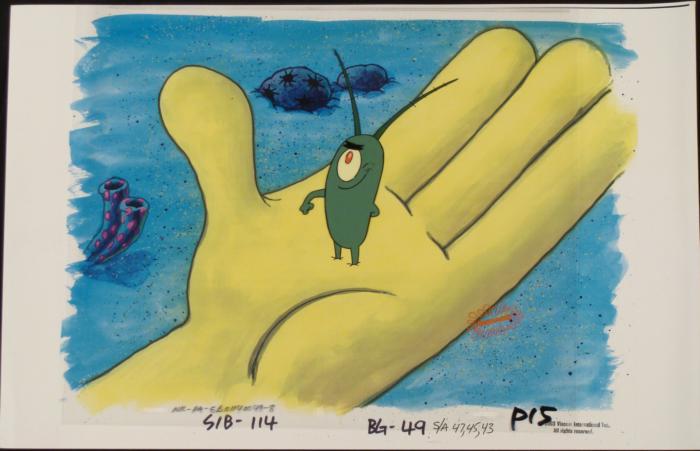 This original hand-painted background and animation cel are from the Nickelodeon TV show SpongeBob Squarepants. The story takes place under the deep blue sea in Bikini Bottom, where SpongeBob resides. SpongeBob, who is a yellow, porous sponge, is your typical happy-go-lucky character, as he is always cheerful and enjoys making people laugh. Patrick Star, SpongeBob's neighbor who is a starfish, is your average children's show idiot, as he boasts knowing nothing and is often getting himself into ridiculous situations. Between the homes of these two lies the home of the miserable Squidward, a squid, who is known for being grouchy and playing tricks on SpongeBob and Patrick. Both SpongeBob and Squidward work at the Krusty Krab, a fast food business run by the greedy money-loving Mr. Krabs, a crab, the arch rival of the evil, possibly misunderstood, Plankton. Another neighbor, Sandy Cheeks, an athletic squirrel who normally wears an astronaut's space suit, was introduced in "Tea at the Treedome." She spends most of her time inventing and experimenting. Plankton seems to have something behind his back.Original Production Background and Animated Cel Overall Size of Background: 11" x 17" Overall Size of the Cel: 10 1/2" x 12 1/2" Very good condition; it has been storedThis is an original hand-painted cel set-up used in the production of an episode of "SpongeBob SquarePants." Each one-of-a-kind set-up represents a slight change in position of the characters. When individually photographed and projected in rapid succession, the images appear to move.