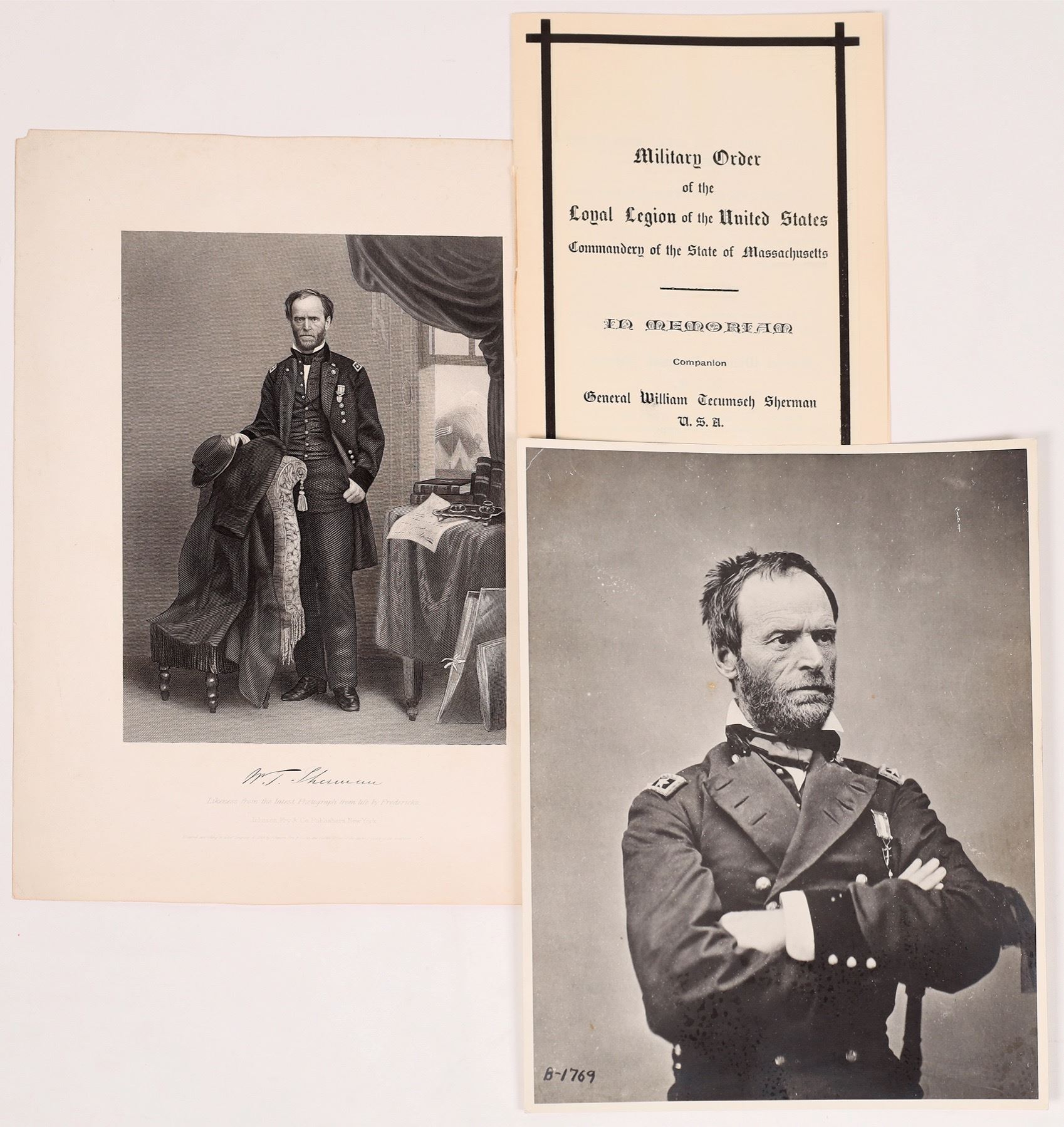 This memorial speech written at the time of General William Tecumseh Sherman's death in 1891 includes a copy of his hand written letter to the Governor of Louisiana on the18th of January, 1861 proclaiming his loyalty to the Old Government of the United States and that the governor "should take immediate steps to relieve me the moment that the state determines to secede." This would be Sherman's defining moment. This eulogy was presented by the Military Order of the Loyal Legion of the State of Massachusetts in Memoriam for Companion General William Tecumseh Sherman April 9, 1891. This is four pages of the eulogy speech with two pages of the copy of Sherman's letter to the governor. Accompanying this document are two likenesses of Sherman; one is an etched copper plate of the General in his blues wearing the usual scowl. ( 8 1/2 in. X 11 in. Johnson, Fry & Co. N.Y.) And the other is a National Archived photo 7 1/2 in. X 10 in. series B-1769. Sherman always appeared with this familiar scowl as a lasting reminder of the uselessness of the Civil War. He also planned for a cannon from Fort Sumter to be placed at the entry to the Military School at Louisiana Sate University where he taught; as a reminder to forever stay loyal the United States Government. The cannon is still there. State:Massachusetts City: Date: Provenance: