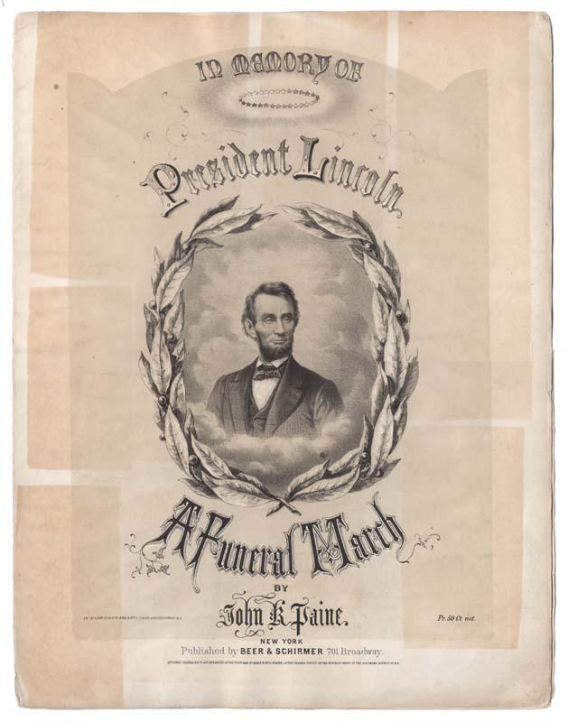 [LINCOLN]. Sheet Music. 11” x 14”. 8 pages. Composed by John K. Paine. Published by Beer & Schirmer, New York. 1865. Portrait of Lincoln surrounded by a wreath of leaves. Some light toning on front.