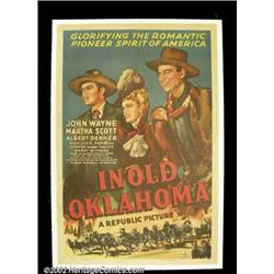 In Old Oklahoma (Republic, 1943). One Sheet (27"X41"). Oil strikes in the Oklahoma territory providing the backdrop for this John Wayne western. Wayne would visit the subject again in 1969 for "The Hellfighters"! Fine+ on Linen.Important notice: We expect to be auctioning lots at the rate of 200-250 per hour. Sometimes eBay Premier live bid software cannot keep up with that pace, so we strongly recommend that you place a realistic proxy bid now as insurance to avoid disappointment. Also please note that all Heritage/CAA lots purchased through eBay Premier carry a 20% Buyer's Premium.