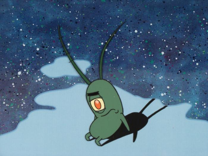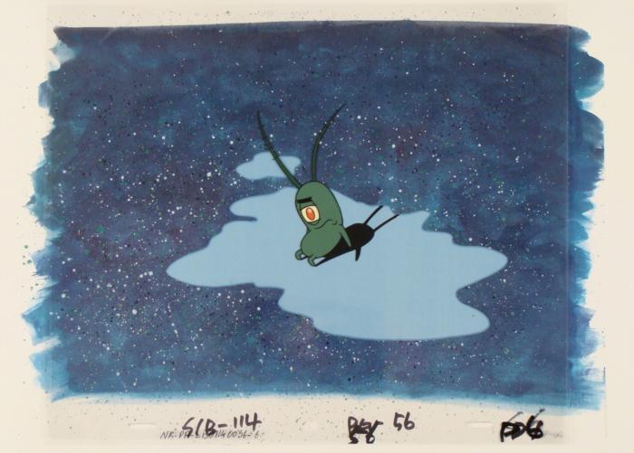 To create production cels, the original animator's drawing is transferred onto an acetate cel (by hand-inking and/or photo copying). The cel is then hand-painted on the reverse side. The background accompanying this set-up is a hand-painted original production background. The printed background is ready to be matted and framed. It is a colored background with a cel and has the animator's notations at the bottom of the background and the cel. The background is a printed reproduction background. The cel has multiple layers; first is Plankton and the second cel is Plankton's shadow.