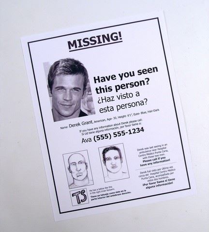 Screen used, Missing Person sign for Derek (Cam Gigandet) and picture of him on the front. (approx. 8" x 11") Condition may vary.