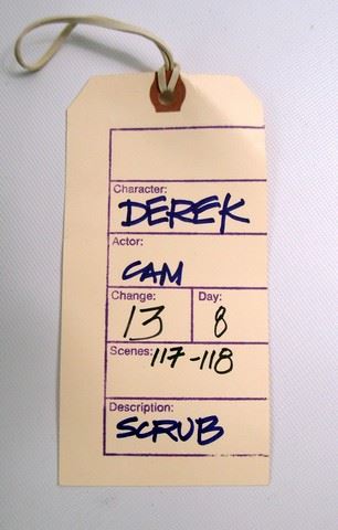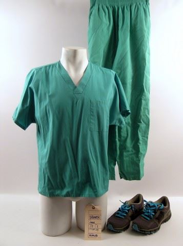 Derek (Cam Gigandet) screen worn, hero, green short sleeve 'Cherokee' scrub top and bottoms, (size S) and black with electric blue shoe laces 'Nike' athletic shoes. (size 10) Includes wardrobe tag!