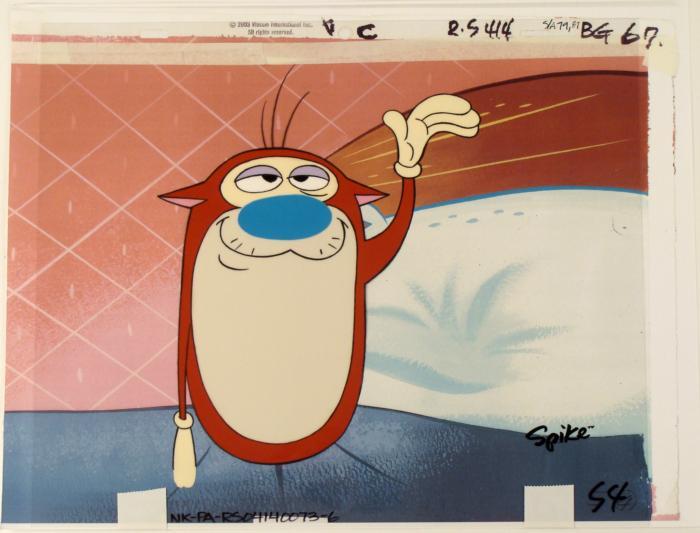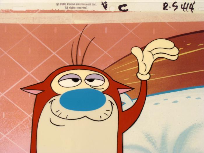 This is an original production animation cel from the Nickelodeon TV show Ren & Stimpy. The show follows two characters - Ren, a crazy Chihuahua - and - Stimpy, an incredibly stupid cat - as they think up to all kinds of hair brained schemes and get themselves into some sticky situations. The Ren and Stimpy Show debuted in August 1991 with a two-part episode, 'Stimpy's Big Day / The Big Shot' and became an instant hit. It was the third Nicktoon ever to be aired on the Network alongside Doug and Rugrats. It appears that Stimpy is in some transient state of mind.Original Production Art Cel Cel Overall Size of the Cel: 10 1/2" x 12 1/2" Overall Size of the Background: 11" x 14 1/4" Excellent condition This is an original hand-painted cel set-up used in the production of an episode of "The Ren & Stimpy Show." Each one-of-a-kind set-up represents a slight change in position of the characters. When individually photographed and projected in rapid succession, the images appear to move.