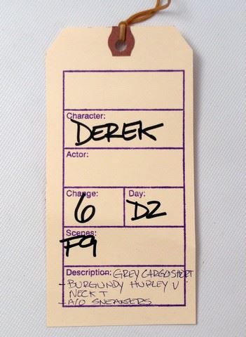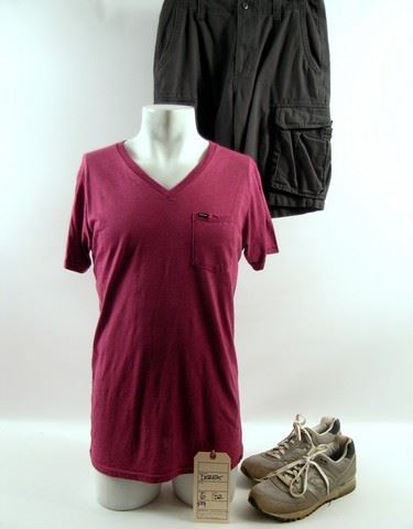 Derek (Cam Gigandet) screen worn, hero, burgundy v-neck 'Hurley' t-shirt, (size M) grey 'Old Navy' cargo shorts, (size 32) and grey 'New Balance' worn shoes. Includes wardrobe tag!
