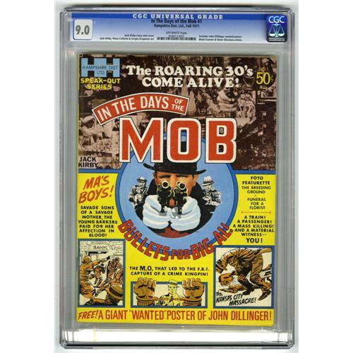 <B>In the Days of the Mob #1 (Hampshire Distributors, 1971) CGC VF/NM 9.0 Off-white pages.</B></I> Includes John Dillinger "wanted" poster. Jack Kirby cover. Kirby and Sergio Aragones art. Overstreet 2006 VF/NM 9.0 value = $83; NM- 9.2 value = $110. CGC census 2/07: 2 in 9.0, 6 higher.<BR><BR><b>Shipping:</b> Comics - Slabbed (certified) (<a target="_blank" href="http://www.heritageauctions.com/common/shipping.php">view shipping information</a>)