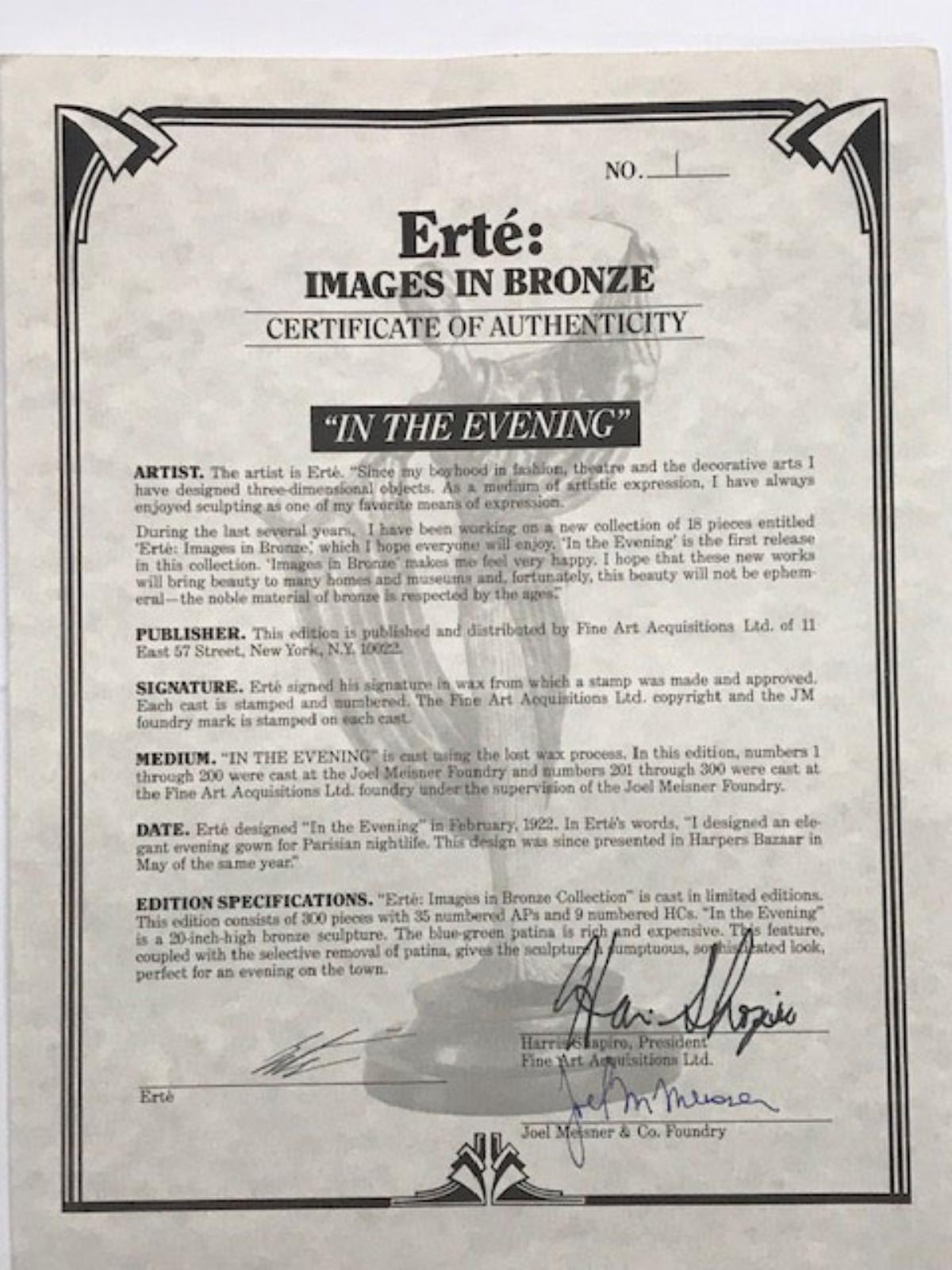 "In The Evening" by Erte Bronze. Limited Edition #1 of 300 - 19" x 8" x 6" - Erte designed "In The Evening" in February 1922. In Erte's words "I designed an elegant evening gown for Parisian nightlife. This design was since presented in Harpers Bazaar in May of the same year"