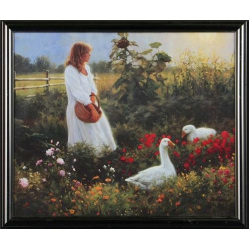 Duncan brilliantly captures this charming scene of a woman in the garden with her two geese in this print entitled ?In the Garden?. The incredible realism in the foreground plays with the viewer?s imagination. This very masterful piece is complimented by a black aluminum frame that compliments the fantasy-like portrayal of this tremendous landscape. The framed picture measures a total of 11?x 13?. Duncan?s use of atmospheric perspective gives depth to this excellent composition. Signed in the bottom right corner, this print would be a great addition to any art enthusiast?s collection and is remarkably priced.